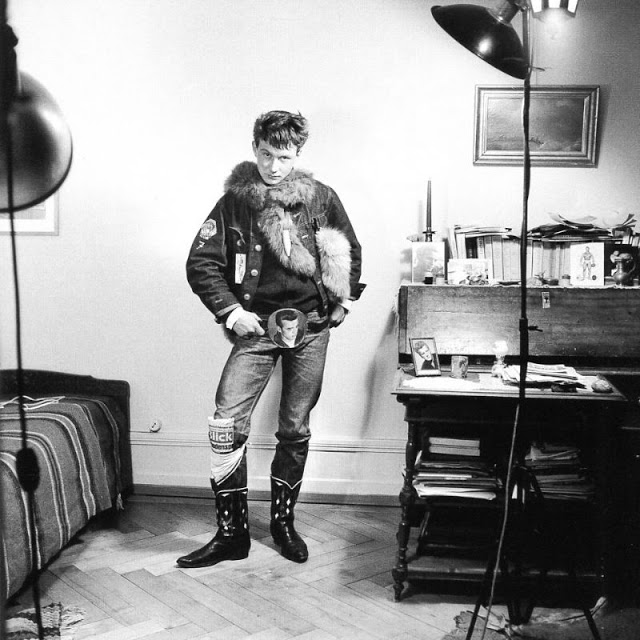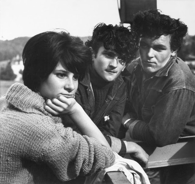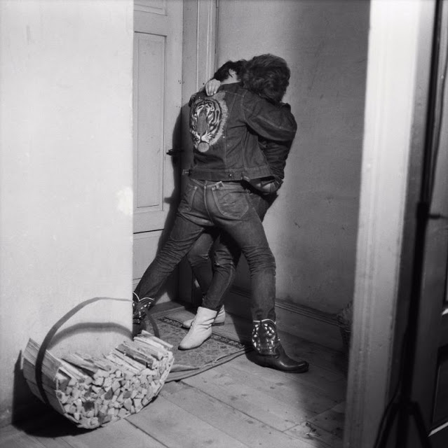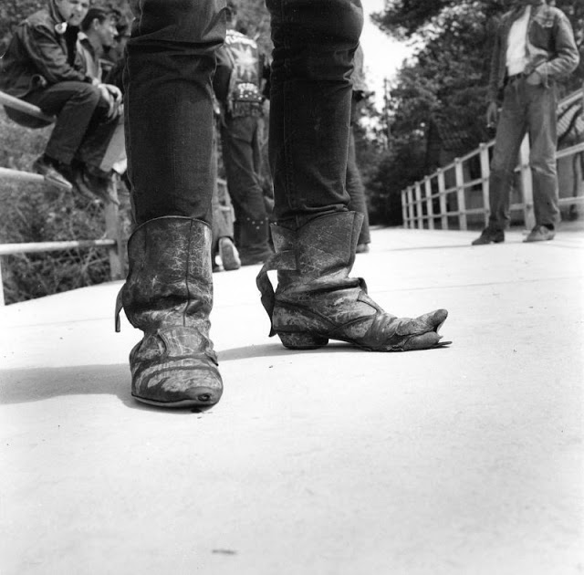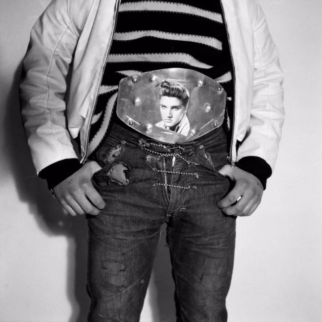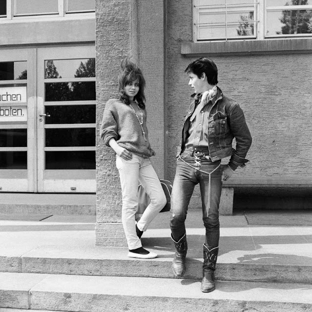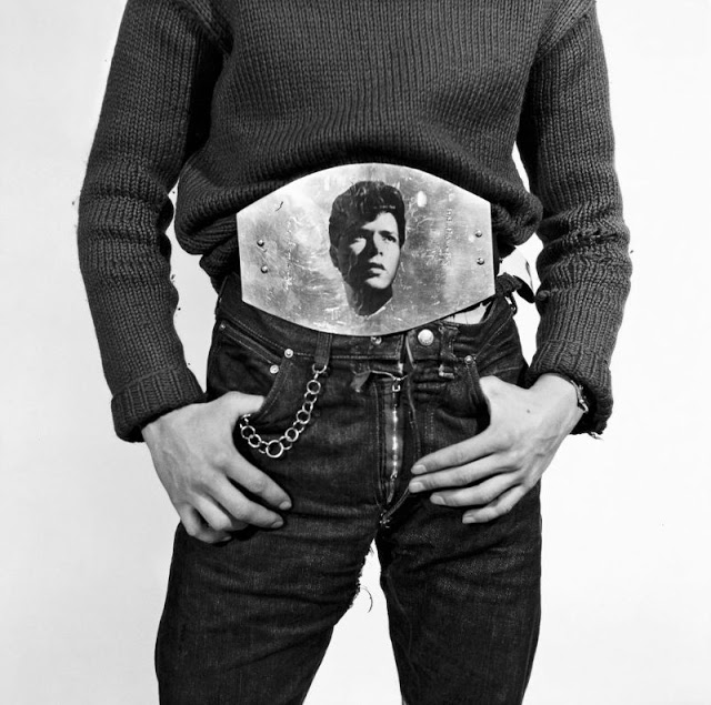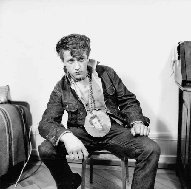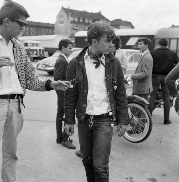 According to The Selvedge Yard, in 1958, Karlheinz Weinberger met a member of a small band of teenagers and began photographing them both at his home studio as well as at the public parks and carnivals where they gathered. In post war Switzerland, these self-named “rebels” were comprised of working class boys and girls dissatisfied with the conservative and conforming culture of the day. Inventing their own code of behavior and dress they affected a powerful gang identity expressed by an affinity for like-minded American imports such as James Dean, Elvis, blue jeans and motorbikes.