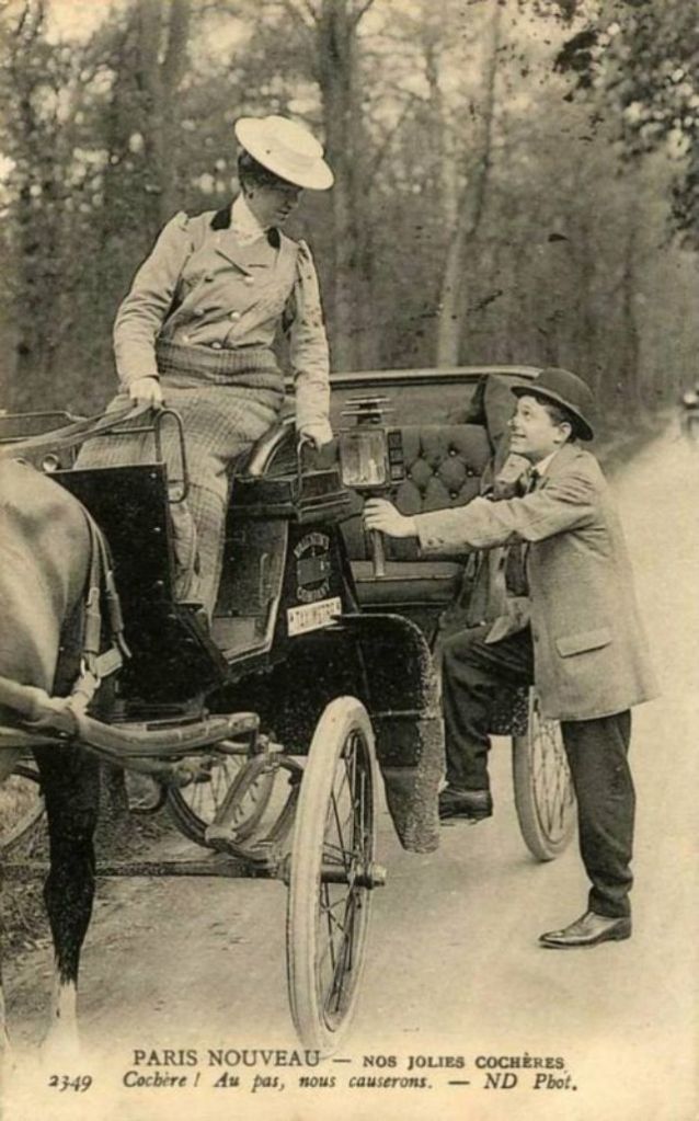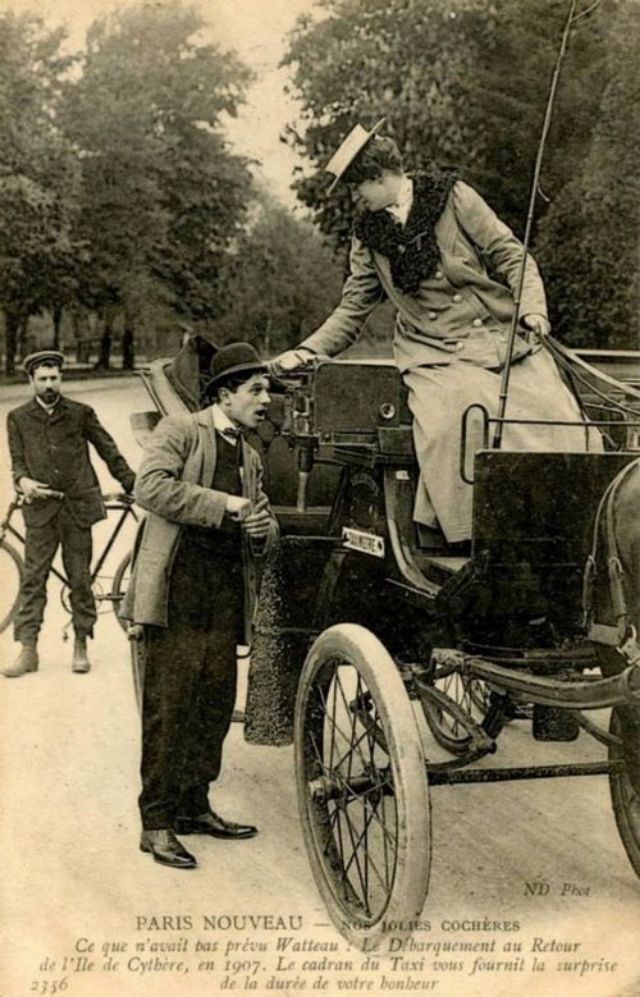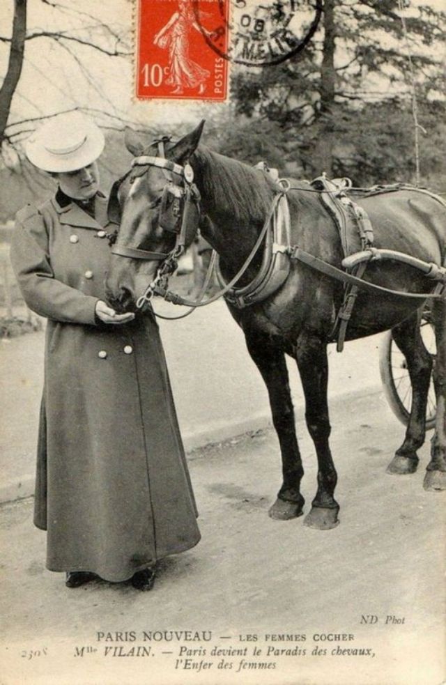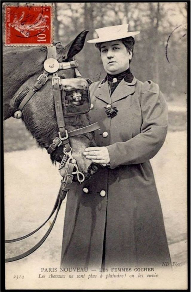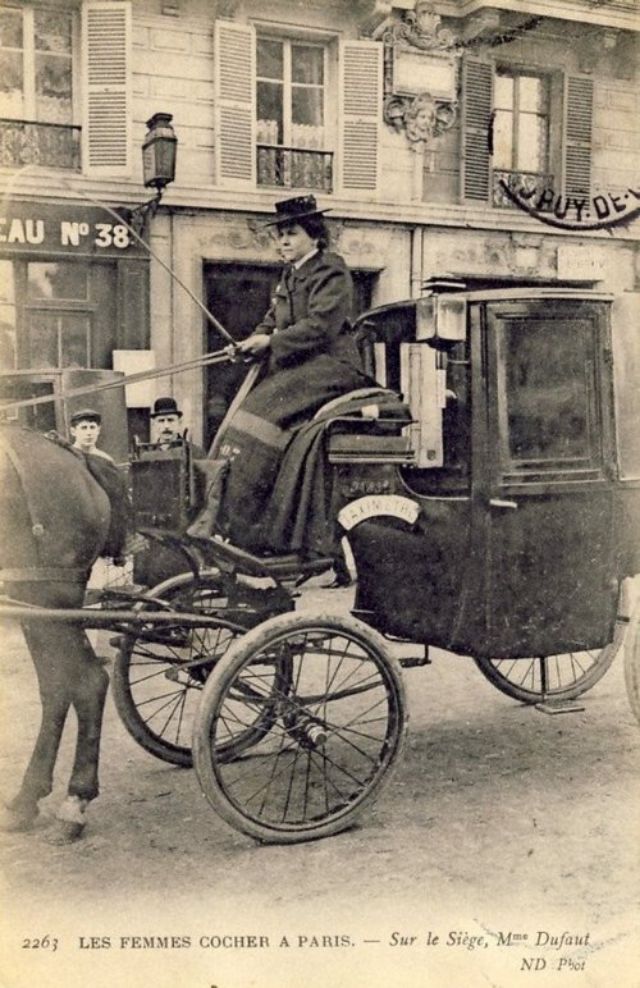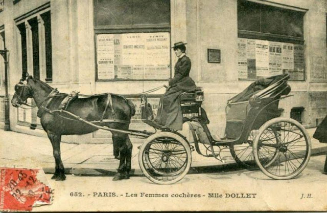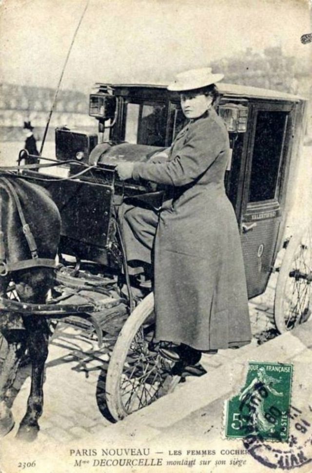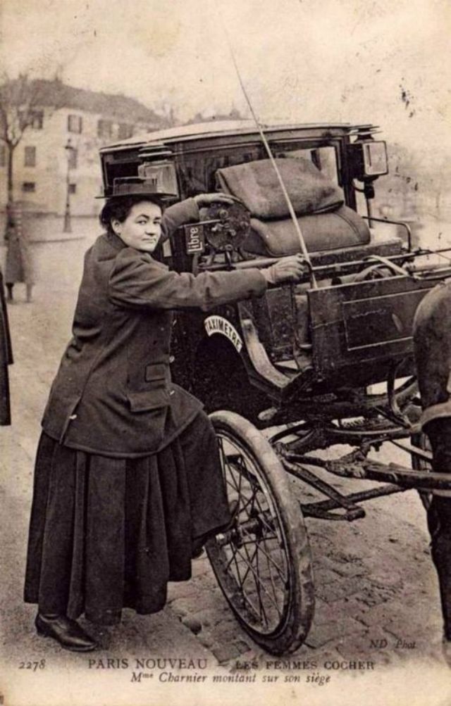 In November, 1906, three women began a month-long apprenticeship in preparation for the Prefecture of Police examination that would qualify them to drive horse cabs in Paris. Several other women were accepted into the apprenticeship program soon afterward.