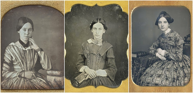 Daguerreotypes, the first commercial form of photography, appeared in America around the year 1839. These were produced by first sensitizing a polished silvered copper plate with iodine vapor, and then exposing the plate to light. The image was developed over hot mercury, fixed, and rinsed. This was a direct positive process, meaning that no negatives were produced, and so each daguerreotype is unique. Daguerreotypes can be easily distinguished from other early photographs by their reflective, mirror-like surface.