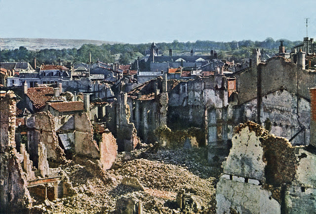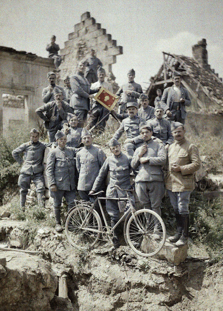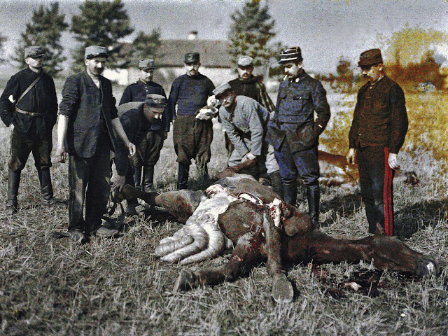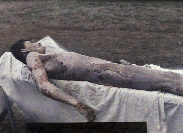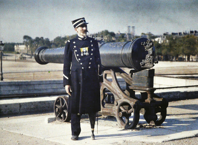 France: c1915. Autochrome. French Soldier. Photographer Unknown. It has been estimated that France lost approximately 1,397,800 soldiers with another 4,266,000 wounded during World War I. There is, of course, no way of knowing whether this particular soldier survived the fighting since his name has been lost to history. Perhaps this autochrome was taken while on leave to visit his family or photographed by a fellow soldier and sent home as a keepsake. France: September 1916. View of Verdun after 8 months of bombing. Battle of Verdun. Western Front. World War I. Autochrome Lumière. Photo: Jules Gervais-Courtellemont (1863 – 1931). France: 1916. World War One. French Gunners receiving instruction, 1916. France 1914-1918. The remains of a dead French soldier and his gun are lying under a tree on the Western front during World War I. Autochrome Lumière. Photo: Stéphane Passet (1875 – ?). Aisne, France: 1917. Battle of the Aisne. French soldiers of the 370th Infantry Regiment are eating soup during the battle of the Aisne, Western Front, World War I. Autochrome Lumière. Fernand Cuville (1887-1927). France 1914-1918. French Artillery soldiers are shown at the entrance of their shelter on the Western Front. 1. World War I. Autochrome Lumière. Photo: Stéphane Passet (1875 – ?). France 1914-1918. A French soldier with an acoustic listening device capable of tracking air planes in preparation of anti-aircraft guns on the Western Front. World War I. Autochrome Lumière. Bucy-le-Long, Aisne, France: 1917. Battle of the Aisne A French section of machine gunners has taken position in the ruins during the battle of the Aisne, Western Front, World War I. Autochrome Lumière. Fernand Cuville (1887-1927). Messines, Flanders, Belgium: 1917. Autochrome Lumière. A crater (diameter 116 m, depth 45 m) after the explosion of 19 mines placed underneath German positions near Messines in West Flanders by the British on June 7, 1917.A total of about 10,000 soldiers died, amongst them almost all of the 3rd Royal Bavarian Division. The mines consisted of 21 t of explosives (Ammonal). The blast was one of the biggest non-nuclear explosions of all times and was audible in Dublin and London. World War I, Western Front. Photo: Fernand Cuville (1887-1927). Nine French soldiers are investigating a fatally injured horse on the Western front during World War I. France (1914 – 1918). Autochrome Lumière Photo: Stéphane Passet (1875 – ?). France: April 1. 1918. The corpse of a French soldier of the 99th infantry regiment, who was poisoned during a German gas attack on March 23, 1918 and died eight days later of pneumonia. Western Front. World War I. Autochrome Lumière. Photo: Aubert. The wreck of a German tank, which was destroyed during a battle on the Western Front (1914 – 1918). World War I. Frankreich. Autochrome Lumière, Charles Adrien (1866-1930). Reims, Marne, France: 1917. A little girl is playing with her doll. Two guns and a knapsack are next to her on the ground. World War I, Western Front. Autochrome Lumière Photo: Fernand Cuville (1887-1927). Département Aisne, France: 1917. French officers of the 370th Infantry Regiment are posing in the ruins after the attack of German troops at the Chemin des Dames near Reims during World War I. They have a bicycle and the flag of the 370th Infantry Regiment. The region was one of the worst battle grounds on the Western Front during World War I. Autochrome Lumière. Photo: Fernand Cuville (1887-1927). France: 1918. A soldier in uniform with three medals is standing next to a cannon in Paris. His left leg has been replaced by an artificial limb. First World War. Autochrome Lumière. Photo: Jules Gervais-Courtellemont (1863 – 1931).