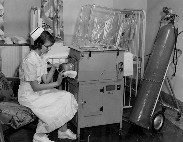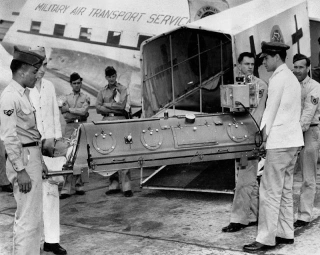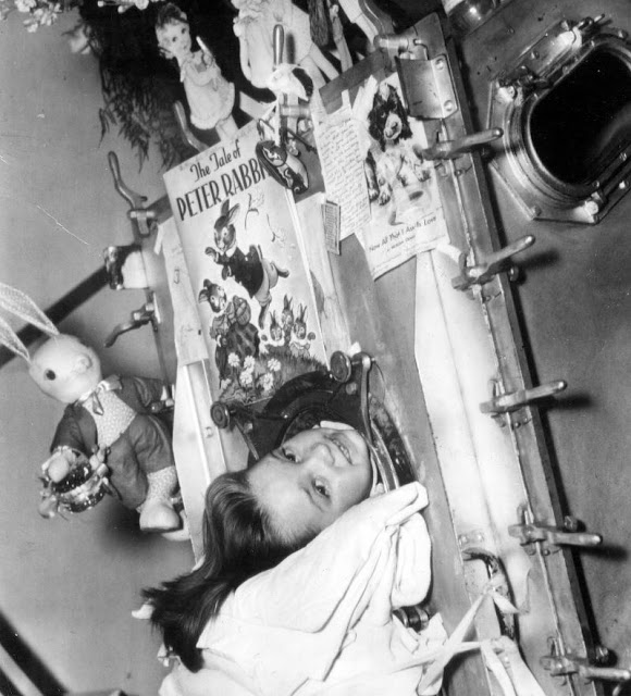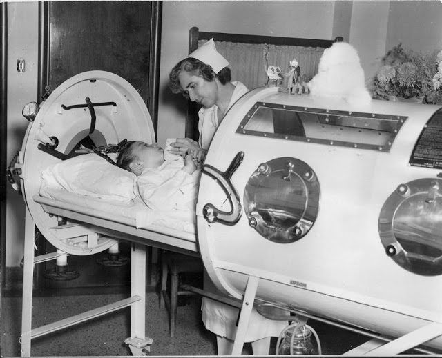 Polio (poliomyelitis) mainly affects children under 5 years of age.1930 Drinker Respirator. When this photo was taken on September 19, 1930, this Drinker iron lung at St. Luke’s Hospital in Chicago, Illinois reportedly was the only one in existence between Chicago and California.Although the patient could breathe in the machine, he could do little else besides look up at a mirror reflecting the room behind him, ca. 1930s.1930 Drinker Iron LungBetty Sue Martin, 5, can still smile after 35 days in an Iron Lung at Johns Hopkins Hospital, ca. 1937.In this 1938 photo from Alton, Illinois, the caption states “An 18 year-old bride with infantile paralysis, Mrs. Myra Rothe is kept alive by an iron lung at St. Joseph’s Hospital here. Physicians gave her a fighting chance to recover.”In this photo dated March 15, 1940, the caption stated “Homemade Iron Lung failed to save life despite ingenuity of father. James Bailey, 25 watching operation of device on his baby son, Paul which kept him alive two days. The infant died soon after. Bailey fashioned the apparatus from an oil barrel, washing machine parts, and rubber tire tubing.”1940s Pediatric Iron LungLate 1940s Iron Lung with Dome1940sVerne Muskopf, a nurse at St. Anthony’s Hospital, South Grand Boulevard and Chippewa Street, helps iron-lung patient Louis Abercrombie smoke a cigarette in November 1949. Abercrombie was a polio patient and had been in an iron lung for almost three years. Hospital policies on smoking were different then.1950s Infant Iron Lung1950s DomeIn the 1950s, Dr. James Wilson developed a multi-person negative pressure ventilator at Children’s Hospital in Boston, MA.Martha Ann Lillard was just 5 in 1953 when she became paralyzed by polio and had to use an iron lung respirator. She spent six decades in the 800-pound device.This 1953 photo shows Professor Hideo Itokawa opening the door of his duralmin lung, which reportedly was produced at one-third the price of similar models available in the United States.Because iron lungs were mostly available in large cities, family from small cities or rural areas often had to travel long distances to visit their family member in a hospital that had iron lungs available. The polio epidemic had just peaked when this photo was taken at Rancho Los Amigos Hospital in Downey, California.In this November 5, 1953 photo, Lauren Carlson, age 24, was being transported in an iron lung to a specialized care center, the Sister Kenny Unit at the Oakland County Contagious Hospital in Farmington, Michigan. Depending on the model, iron lungs weighed between 1000-1800 pounds.In July 1953, the military began using a lightweight unit made of aluminum alloy and plastic. The unit weighed only 150 pounds, approximately 1/10 the weight of standard iron lungs. In this photo, a soldier who contracted polio was being airlifted from Walter Reed Hospital to a Michigan hospital closer to his home.Unable to breathe, patients entered iron lungs, which made use of negative pressure ventilation to compress and depress the chest, simulating respiration, ca. 1955.
