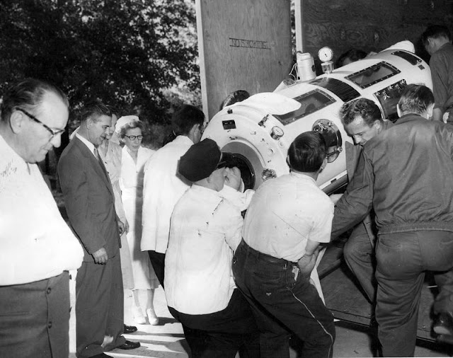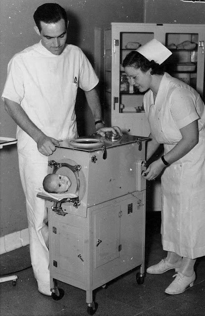 Inventor John Emerson had refined Drinker’s device and cut the cost nearly in half. Inside the tank respirator, the patient lay on a bed (sometimes called a “cookie tray”) that could slide in and out of the cylinder as needed. The side of the tank had portal windows so attendants could reach in and adjust limbs, sheets, or hot packs.