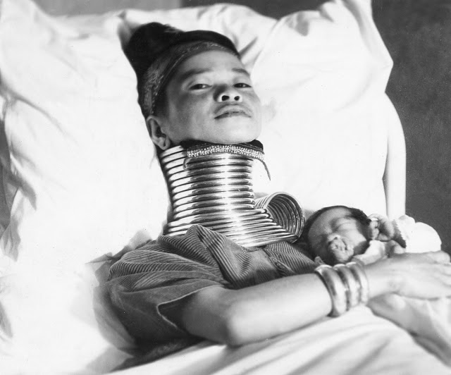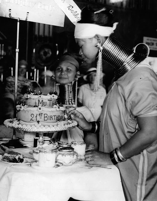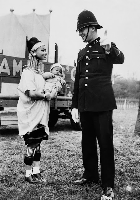 A policeman directs three Padaung women along Elgin Avenue in London.Padaung women with a Grenadier guard at Horse Guard’s Parade, London.Three Burmese women members of a circus play cards as they wear the brass neck and leg rings traditionally worn by Padaung women since childhood and which cannot be removed, London, January 4, 1935. Doctors examine Padaung woman Mu Proa working for the Bertram Mills Circus in London.Padaung women wave at Londoners upon their arrival at Victoria Station.Paduang women arrive by train.Mu Proa with her newborn child.Mu sits up in bed with her baby.Mu Proa with her child.Mu talks to a police officer with her baby.25th August 1936: A Burmese woman, with traditional neck-extending rings, celebrates her twenty-first birthday with a cake in Folkestone with her friend. They are both part of Bertram Mills Circus, where they are billed as the ‘giraffe-necked Burmese ladies’.