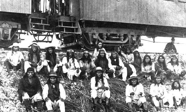 Geronimo (third from the right) and his Apache, during a stop on the Southern Pacific Railway near Nueces River, Texas. 1886.