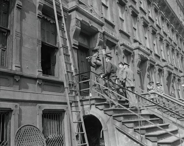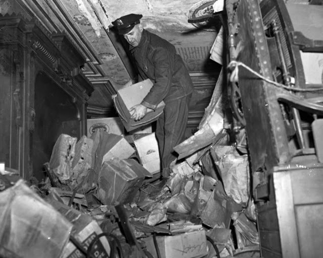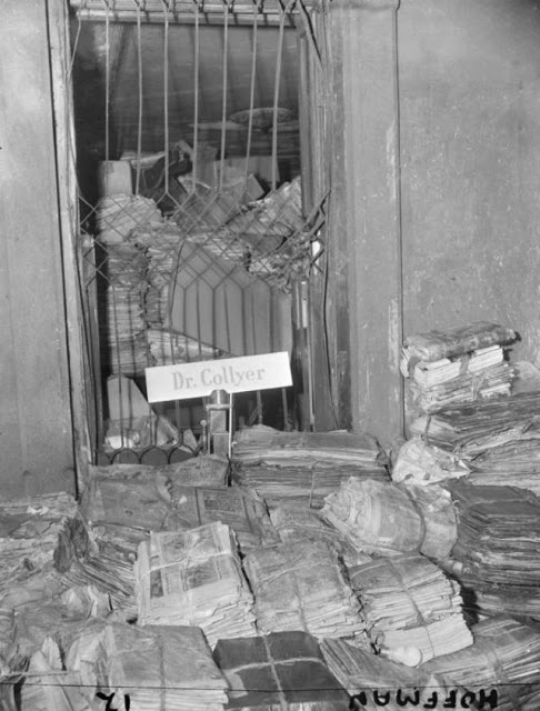 Police attempt to enter the residence of the Collyer brothers after receiving the fateful call about a smell of decomposition coming from the house. March 21, 1947.Policemen reach the ceiling atop the piles of junk inside the Collyer brothers’ home. March 24, 1947.A police inspector surveys the refuse. March 25, 1947.An interior view of the house. March 26, 1947.A Building Department worker crawls through the first floor of the junk in search of Langley Collyer, who authorities might still be hiding somewhere in the building after the discovery of the body of his brother, Homer. March 24, 1947.Patrolman John McLaughlin searches through the junk found inside the Collyer brothers’ house. March 24, 1947.Workers sift through the junk. April 2, 1947.Searchers climb through the junk.Workers search through the piles of refuse.Police comb through the debris. March 25, 1947.Rain-spattered crowds jam the streets outside the four-story brownstone home of the hermit Collyer brothers as police begin their search of the junk-filled mansion on March 24th. Alternately cheering and catcalling as strange items in the Collyer junk collection were lowered from the roof of the house, the crowd waited to see if Langley Collyer, the surviving brother, would be discovered by police.An interior view of the Collyer brothers’ house after the discovery of Homer’s body. April 2, 1947.Newspapers sit piled up inside the house. April 2, 1947.Inside the house. April 2, 1947.Reporters survey items removed from the Collyer brothers house and tossed out onto the street. Date unspecified.