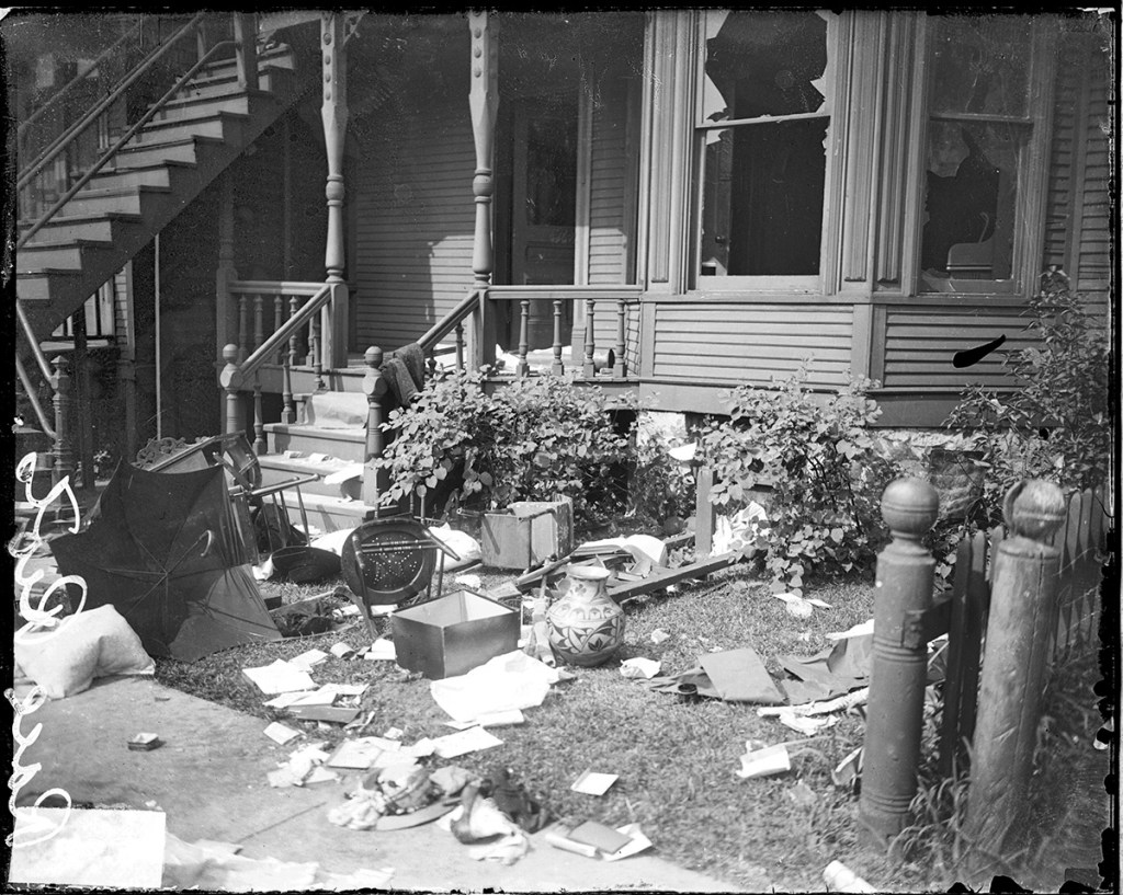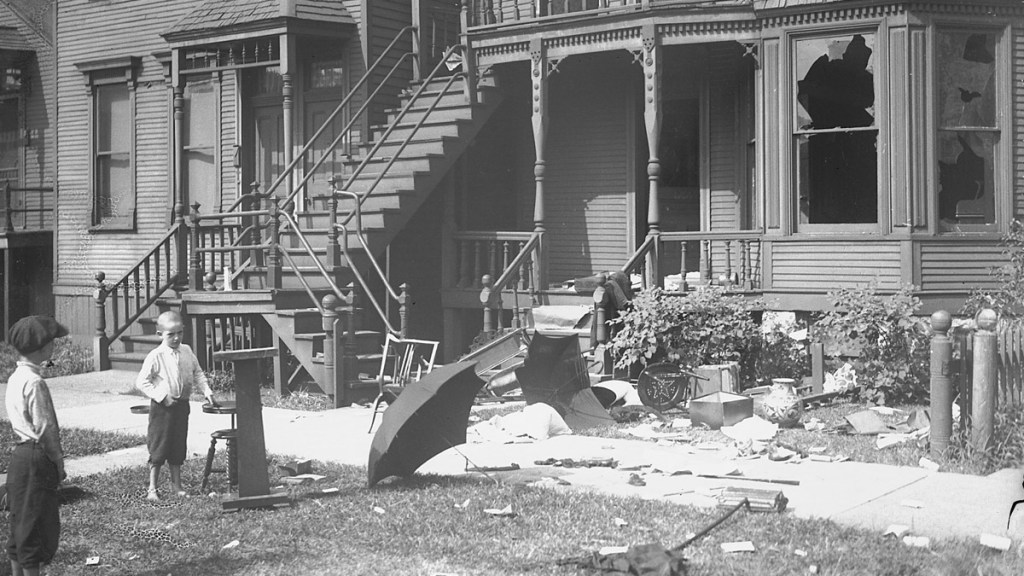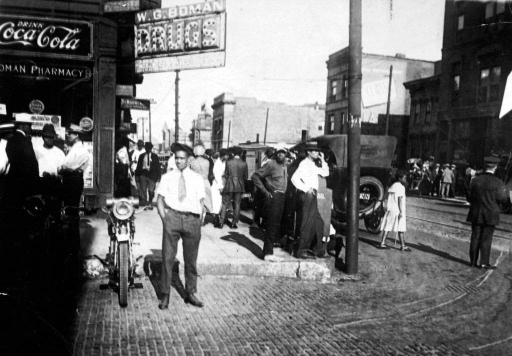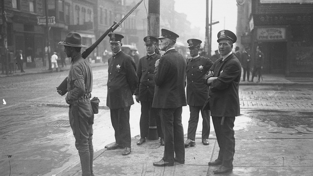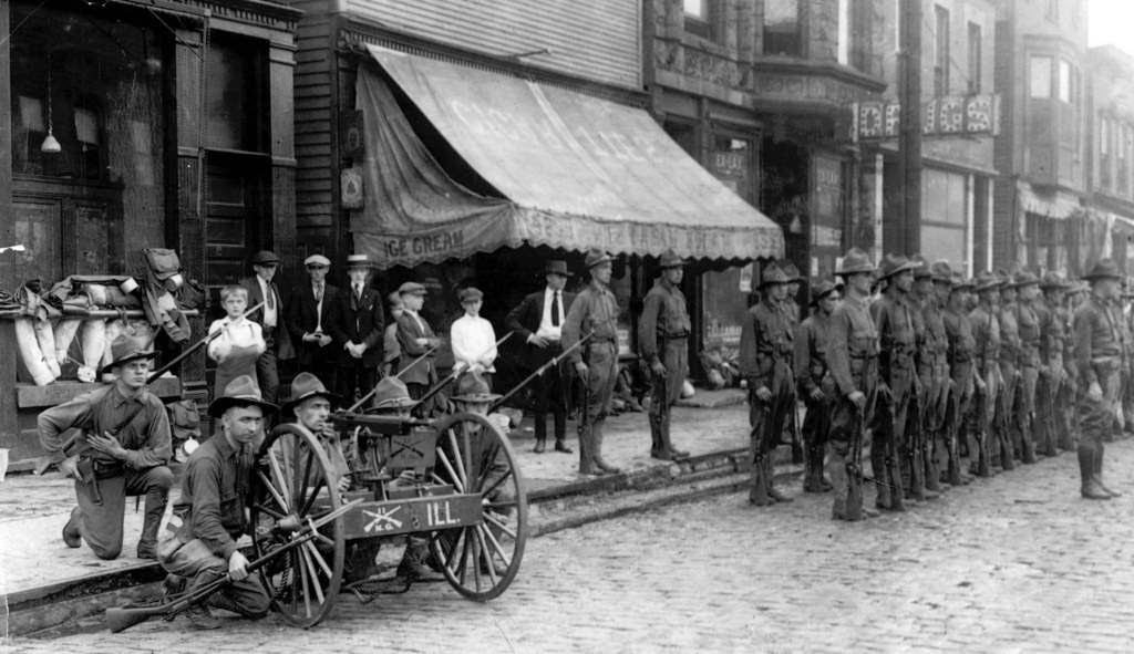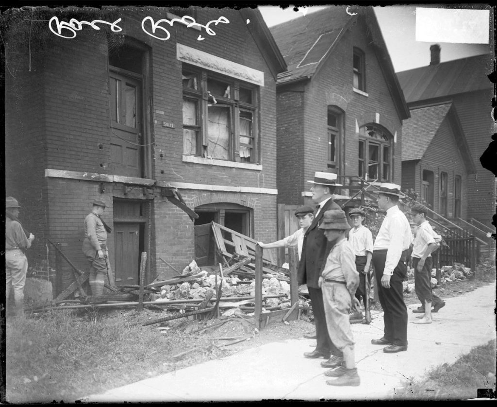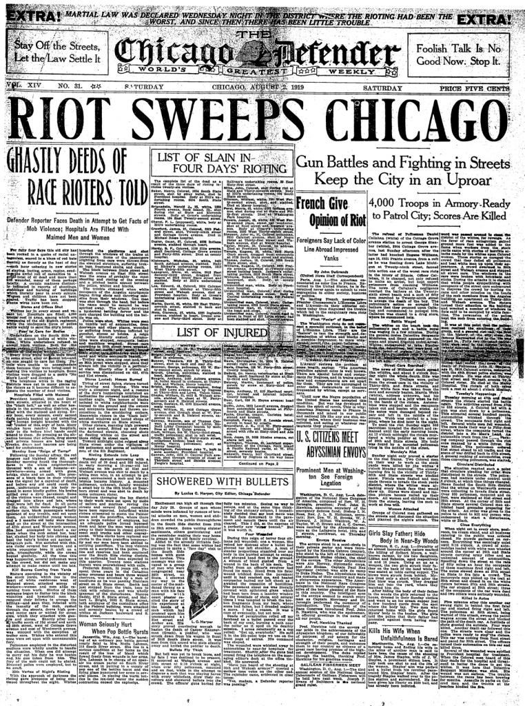 A member of the state militia faces off against an African-American veteran during the 1919 Chicago Race Riot. July 27, 1919.Vandalized first floor of houseTroops gather at 47th Street and Wentworth Avenue during the Chicago race riots in 1919The state run militia patrols the streets of Chicago during the race riot of 1919. Photo dated Aug. 1, 1919.1919 Race RiotPolice remove the body of a black man killed during the 1919 race riotsPeople moving from house, accompanied by policemen during race riotsMob chasing victim during race riotskids cheering a burning houseIllinois National Guard soldiers questioningHeavily armed motorcycle and foot policemen stood at the ready for instant transportation to quell the rioting on Chicago’s south side on July 30, 1919.Five policemen and one soldier with rifle standing on street corner in the Douglas Community area.Chicago DefenderChicago race riot of 1919.Chicago Daily TribuneBlack residents of the south side move their belongings with a hand-pulled truck to a safety zone under police protection during the Chicago race riots of 1919.A group of white men and boys examine the destroyed homes of black Chicago residents after the city’s 1919 riot.A soldier tells a man to back up during the race riots in Chicago in 1919. The soldiers were in place to keep white people in their own district.A police officer stands in front of Burke’s Lunch Room in the heart of Chicago’s business district July 30, 1919A man armed with a machine gun sits at the Cook County Jail during the 1919 Chicago race riots.A firefighter looks over a burned out building during the Chicago race riots of 1919.A black resident of the south side moves his belongings to a safety zone under police protection during the Chicago race riots of 1919