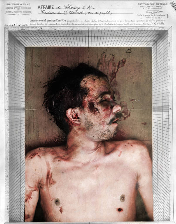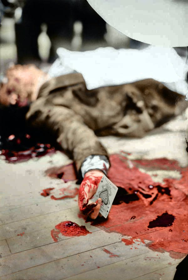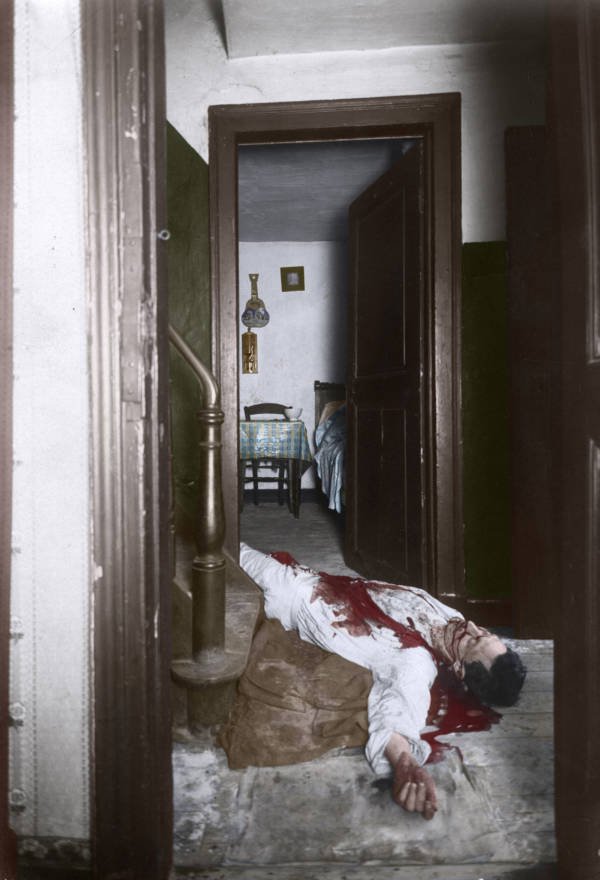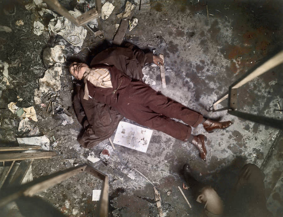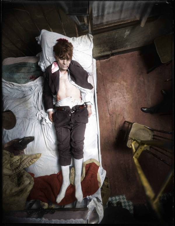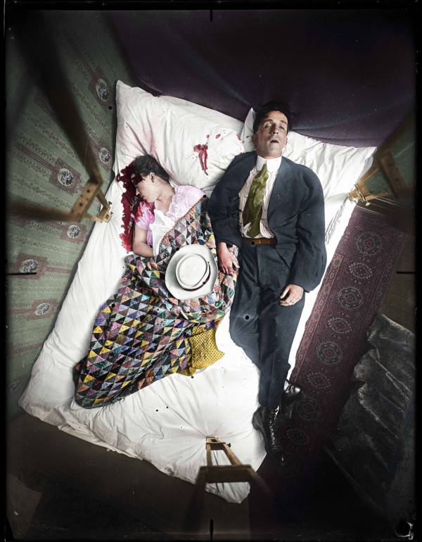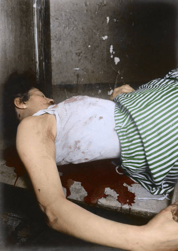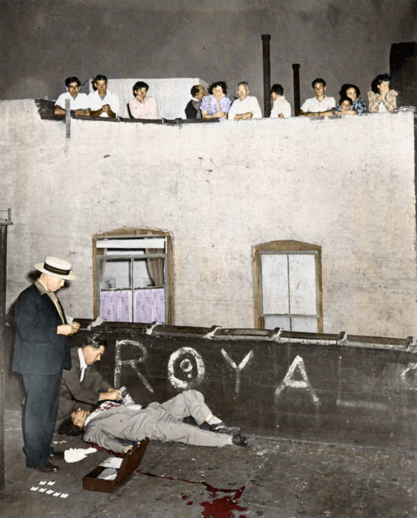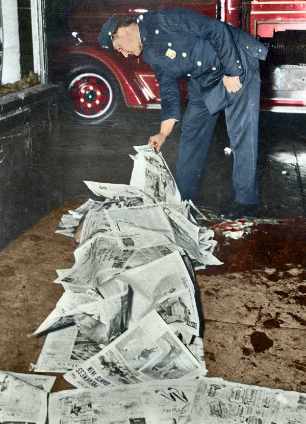 Mafia kingpin Joe Masseria holds the ace of spades, “the death card,” in his hand following his murder on the orders of infamous gangster Charles “Lucky” Luciano in a Coney Island restaurant. 1931.The bodies of two would-be thieves named Robert Green and Jacob Jagendorf after a failed robbery attempt that ended when they accidentally fell down the building’s elevator shaft. New York. 1915.Unspecified New York murder scene. 1916.A New York police officer takes a peek at a dead body covered with newspapers. 1943.Murdered gangster David Beadle, also known as “David the Beetle,” in front of The Spot Bar and Grill in Manhattan. 1939.A police officer crouches under the rear end of a taxi jacked up on a crate and garbage can as the dead body of a man who was hit by the cab lies underneath. 1943.Forensic detectives take the fingerprints of murdered store owner Joseph Gallichio, as he lies on the roof beside his cage of racing pigeons. New York. 1941.The body of a man named Antonio Pemear, who was found murdered in his bed in Brooklyn. 1915.Scene of a murder-suicide in New York’s Central Park. 1952.Two police officers with a dead body in a New York apartment stairwell. 1957.The Saint Valentine’s Day Massacre, in which seven members of the North Side Gang were trapped in a garage, lined up against the wall, and shot to death by members of Al Capone’s rival gang during a power struggle for control of Chicago. 1929.The body of Earl “Hymie” Weiss, leader of Chicago’s North Side Gang. He was killed when Al Capone’s men opened fire with a submachine gun on him and his associates while they were visiting a courthouse where an ally of his was on trial. 1926.The murder scene of Arthur “Dutch Schultz” Flegenheimer, a powerful New York gangster in the 1920s and ’30s who was ultimately killed in Newark, New jersey by an assassin hired by the Mafia Commission. The Commission had denied Schultz’s request to murder the prosecutor that was targeting him. When he disobeyed and attempted the murder anyway, the Commission had him killed. 1935.Close-up of a corpse’s battered and bloodied face. Angres, France. 1912.The dead body of Homer Van Meter, an associate of John Dillinger and a notorious bank robber, who was killed after fleeing police in St. Paul, Minn. 1934.A young woman dead in her bed. Circa 1930.The dead body of Al Capone associate Charles “Cherry Nose” Gioe, who was shot through the head by mafia hitmen hired by a Chicago mob boss whose plans Gioe had unknowingly interfered with. 1954.The body of Brooklyn mobster Frankie Yale. He was killed by unidentified rival gangsters following a car chase through the streets of New York. 1928.The body of mobster Benjamin “Bugsy” Siegel, who was killed by an unknown assailant who shot him through a window with an M1 Carbine while he was staying at an associate’s house in Beverly Hills. 1947.The burnt body of gangster Irving Feinstein, who was set on fire by Murder Inc. killers Harry Strauss and Martin Goldstein and left exposed in a lot in New York City. 1938.The dead body of Joseph Rosen, a candy shop owner who was killed by Murder Inc. leader Louis “Lepke” Buchalter in his own store in Brooklyn. 1936.The naked corpse of American aspiring actress and murder victim Elizabeth Short, known as the “Black Dahlia,” lying in a vacant lot in Los Angeles. 1947.The dead body of Andrew Borden, father of Lizzie Borden, in his house in Fall River, Mass. 1892.Newspaper photographer Arthur Fellig, better known as Weegee, examines a body stuffed into a trunk and deposited on a patch of waste ground in New York. Circa 1945.Weegee photographs a human head at the scene of a murder. Circa 1945.A French crime scene. Circa 1930.A dead man at the foot of a staircase in a French crime scene. 1912.A photo of a bloodied couple lying dead in bed in New York. 1915.An unidentified murder victim. Circa early 20th century.An unidentified dead man in New York City. Circa early 20th century.