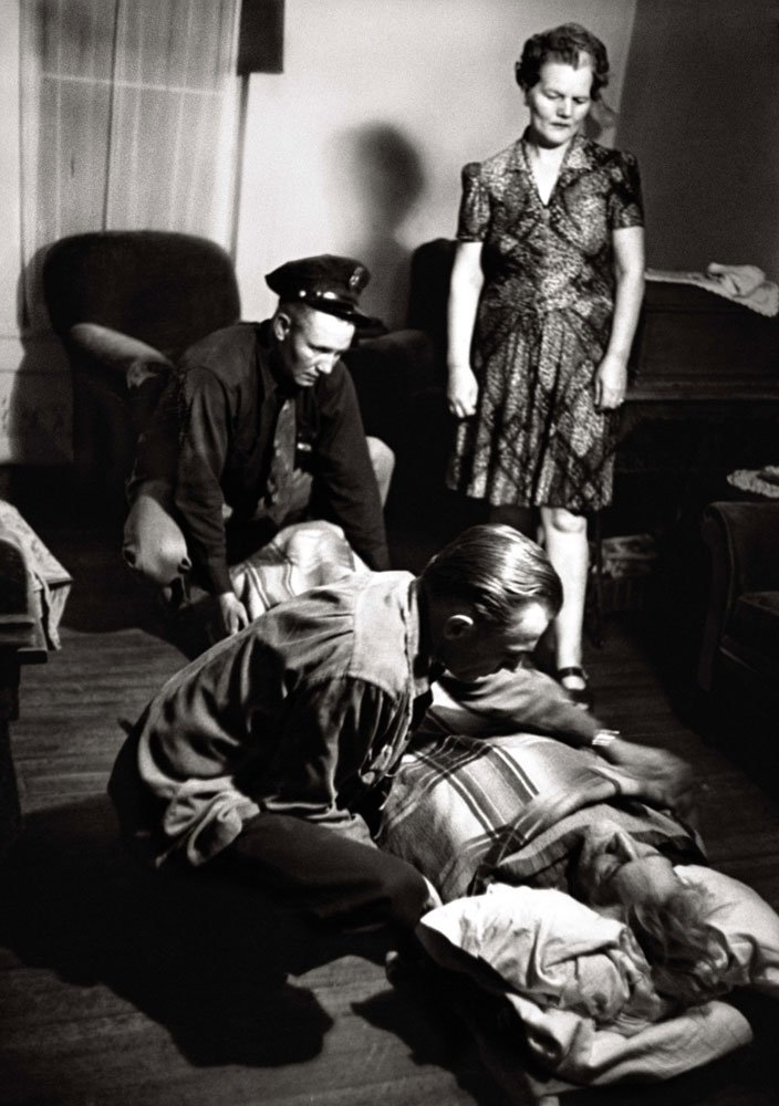 Through it all, Weegee’s twisted sense of humor also helped cement his iconic status. In 1936, he arrived at a crime scene to photograph a dead man whose body had been stuffed into a trunk. For obvious reasons, the photo was too graphic to be printed in a newspaper, so Weegee decided to employ a bit of dark humor for his shot: He snapped a shot of himself looking into the trunk, which took the focus of the photo off of the mutilated body and placed it on himself and made the audience feel as if they were behind the lens themselves.