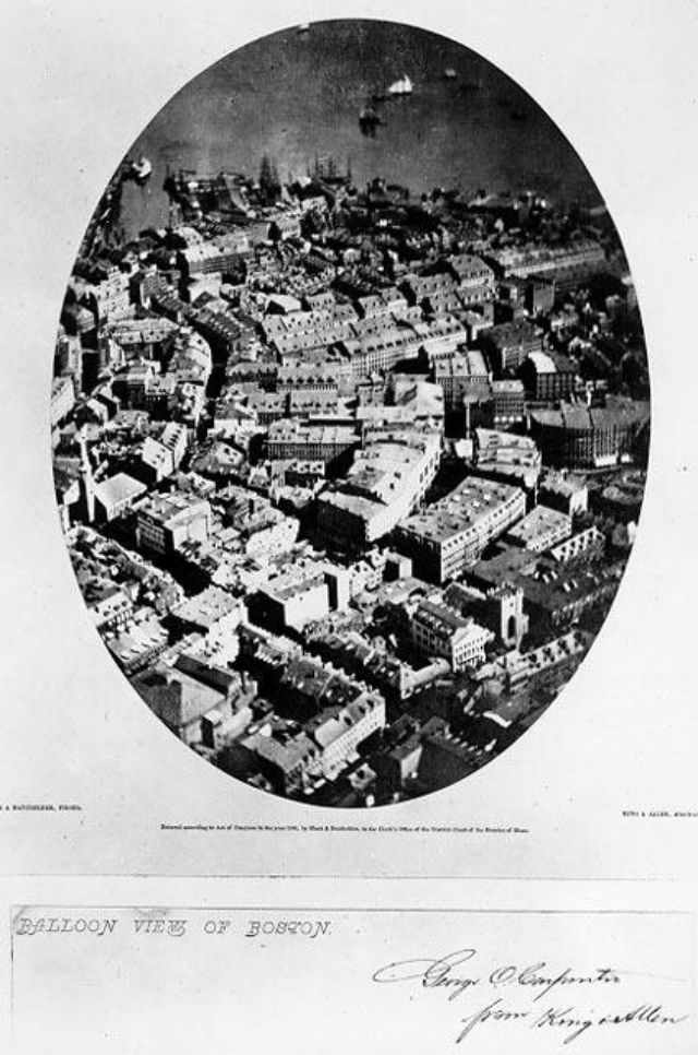 William Blake photographed this aerial view of Boston from a hot air balloon in 1860, courtesy of the Boston Public Library. It was the first successful aerial photographic effort in the U.S., according to the Air and Space Museum.