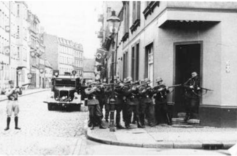 The SS Heimwehr-Danzig huddle around a doorway keeping the Poczta Polska under close observation