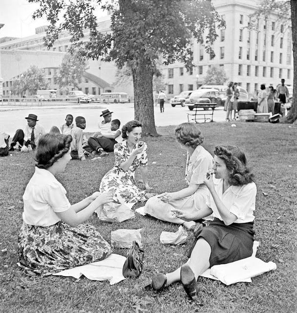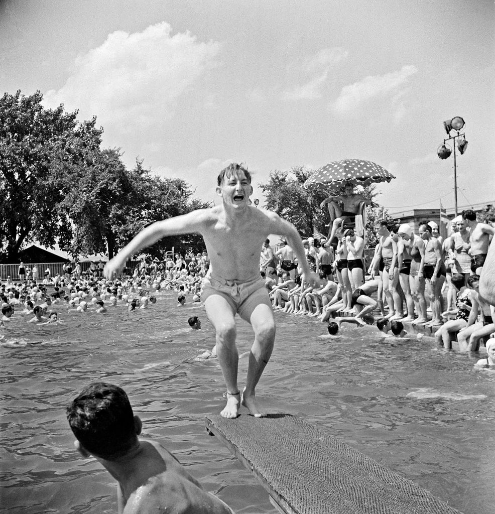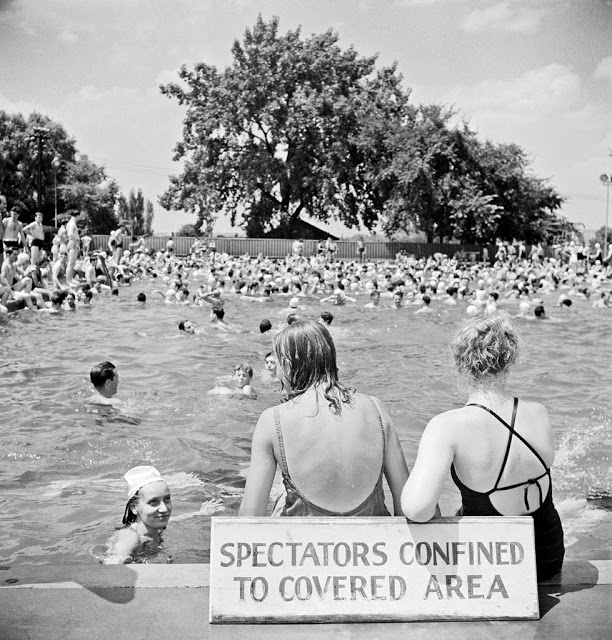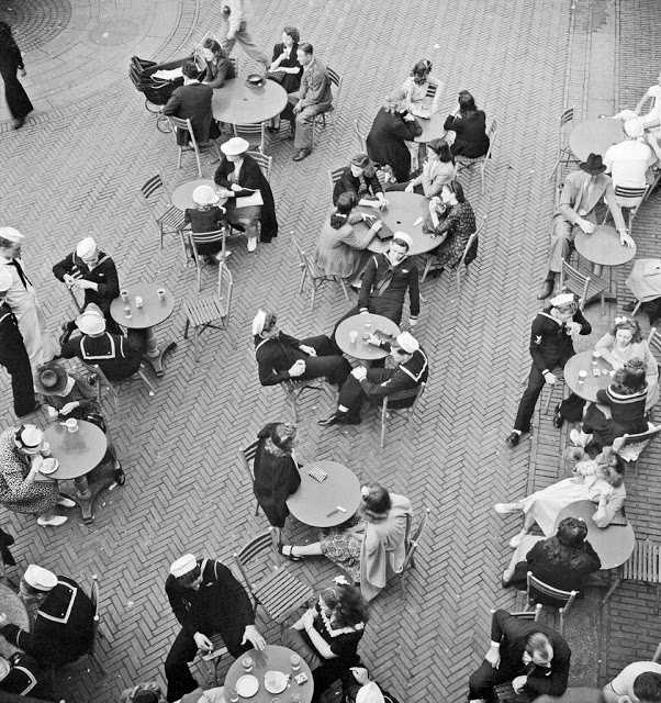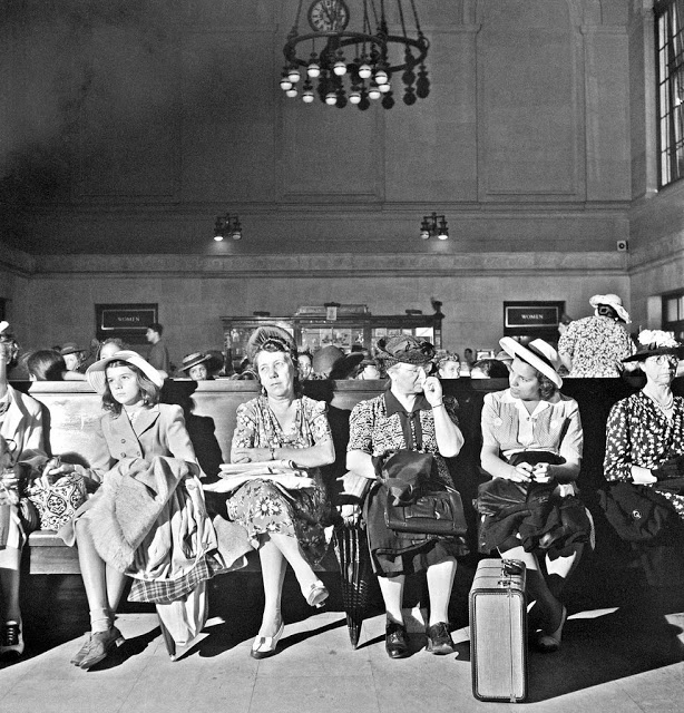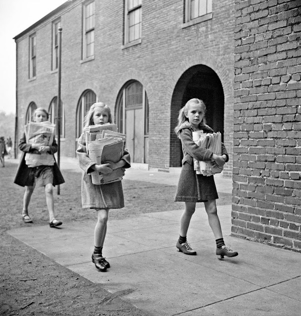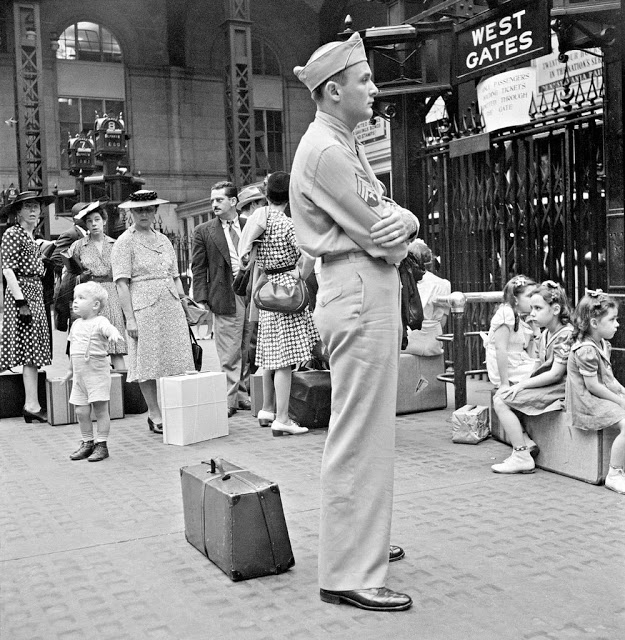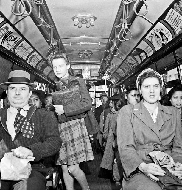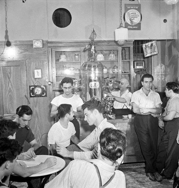 New York. Italian-Americans on MacDougal Street relaxing on Sunday, 1942Washington, D.C. Sunday swimmers at the municipal swimming pool, 1942New York. O’Reilly’s bar on Third Avenue in the ‘Fifties’, 1942Arlington, Virginia. FSA trailer camp project. Hanging out washing in front of the community building, 1942Washington, D.C. Scrap salvage campaign, Victory Program. Washington schoolchild brings a load of scrap paper to school once a week, 1942New York. Italian-Americans watching parade on Mott Street and flag raising ceremony in honor of boys from the neighborhood in the United States Army, 1942New York. Italian-American cafe espresso shop on MacDougal Street where coffee and soft drinks are sold. The coffee machine cost one thousand dollars, 1942Baltimore, Maryland. School children and workers returning home on a trolley at five pm, 1943New York. Waiting room at the Pennsylvania railroad station, 1942New York. Waiting for trains at the Pennsylvania railroad station, 1942Washington, D.C. Watermelon vendor at the farmers’ market, 1942New York. Janet and Marie Wynn (lower left), Czech-American children, climbing on monkey bars in Central Park playground, 1942Washington, D.C. Government workers lunch outside the U.S. Department of Agriculture in Washington Monument park, 1942Washington, D.C. Scrap salvage campaign, Victory Program. Children bringing their weekly contribution of scrap paper to school, 1942New York. The mall restaurant in Central Park on Sunday, 1942Washington, D.C. Municipal swimming pool on Sunday, 1942New York. Italian-Americans in the rain watching a flag raising ceremony in honor of the feast of San Rocco at right, 1942Washington, D.C. Relaxing on the edge of the municipal swimming pool on Sunday, 1942Washington, D.C. Scrap salvage campaign, Victory Program. Children bringing their weekly contribution of scrap paper to school, 1942New York. O’Reilly’s bar on Third Avenue in the ‘Fifties’, 1942
