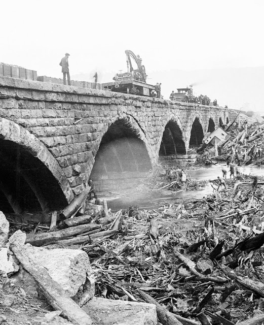 It took 10 minutes for the waters of Lake Conemaugh to pass through Johnstown, and 2,000 people were drowned or crushed in the torrent. A few survivors were washed up along with numerous corpses several miles down the valley. At the old Stone Bridge in Johnstown, debris piled 40 feet high caught fire, and some 80 huddled survivors of the flood perished in the flames. A total of 2,209 died as a result of the disaster.
