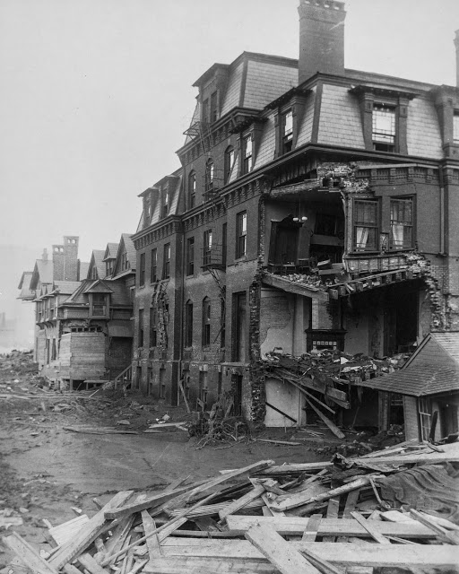 At 3:10 p.m., the South Fork Dam washed away, drowning several laborers who were struggling to maintain it. Club officials on high ground watched awe-struck as 20 million tons of water went roaring down the valley toward Johnstown. The deluge swept through the communities of South Fork, Mineral Point, Woodvale, and East Conemaugh, accumulating debris, including rocks, trees, houses, barns, railroad cars, animals, and people, both dead and alive. By the time it reached Johnstown, at 4:07 p.m., the flood appeared as a rolling hill of debris more than 30 feet high and nearly half a mile wide. In a terrible swoop, the northern half of the city was swept away, sending some 1,500 demolished Johnstown buildings tumbling down with the roaring torrent.