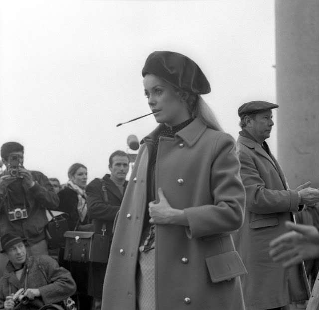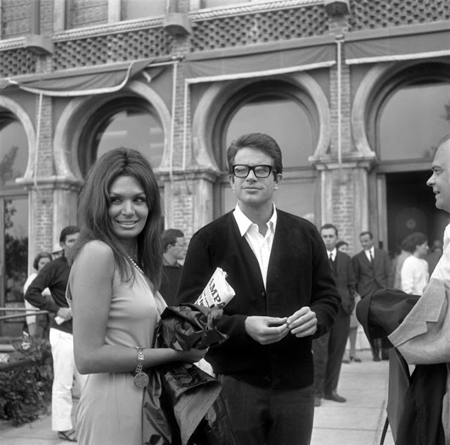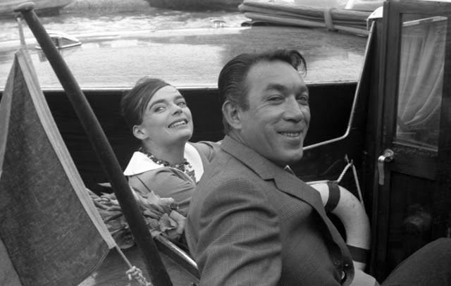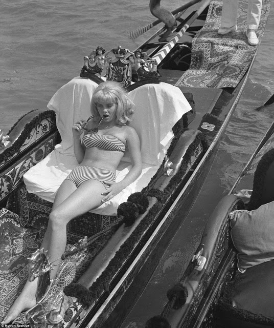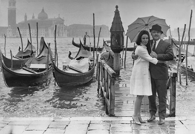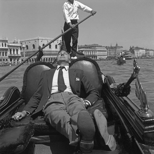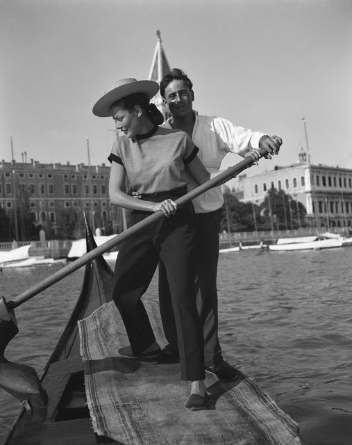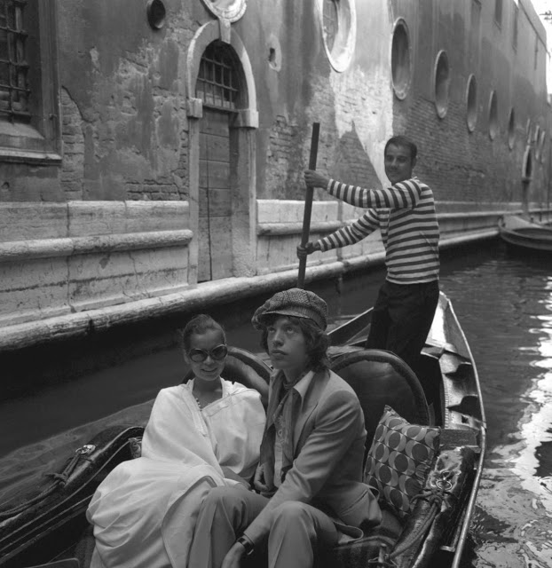 Gene Tierney, wearing a striped short-sleeved nautical-style shirt, donning a hat, tries her hand at rowing a gondola, Venice, 1951.Kirk Douglas, wearing a swimming suit and a necklace chainlet, signing on the thigh of the paintress Novella Parigini, wearing a strapless bikini and round earrings, a woman wearing a strapless polka-dotted bikini, Lido Beach, Venice 1953.Ernest Hemingway, wearing a short sleeves shirt over a plaid shirt, his hurted arm bendaged, drinking vodka from the bottle, Venice 1954.Gary Cooper, on a Venitian gondola, Venice 1955.Sophia Loren at the Venice Film Festival, 1955Mexican actor Anthony Quinn wearing a plaid blazer, with the actress Barbara Steele, standing on a water taxi on the Canal Grande, Venice, 1958.Elizabeth Taylor and her then husband, singer Eddie Fisher, on holiday on Burano Island in the lagoon, Venice, circa 1960.Spanish painter Salvador Dali, wearing a shantung blazer and a fancy silk waistcoat, a straw hat, holding a walking-stick, sitting on a gondola, a gondolier behind him, Venice 1961.Sue Lyon, known for playing Lolita, is pictured wearing a strapless, striped bikini and reclining on a gondola, Venice, 1962.British actress Claire Bloom and her husband American actor Rod Steiger hiding under an umbrella. They were in Venice for the film festival in September 1963.Paul Newman, wearing a tuxedo and a bow tie, portrayed during a trip on a water taxi, a sailor cap on the dashboard, St. Mark Square in the background, Venice 1963.Warren Beatty, wearing a cardigan and glasses, portrayed outside the Excelsior Hotel while standing next to a woman holding a newspaper, Lido, Venice 1965.Jane FondaFrench actress Cathrine Deneuve on the set of the movie Mayerling, wearing a coat and and a beret, a paintbrush in her mouth with photographer behind her, Venice, March 1968.Sean Connery, portrayed on a water taxi with his hair in a mess because of the wind, looking behind his back, in the venetian lagoon with Venice in the background, 1970.Mick Jagger, wearing a suit, sitting next to Bianca Jagger wearing a white poncho and sunglasses, in a gondola, with the gondolier behind them, Venice 1971.