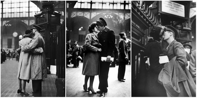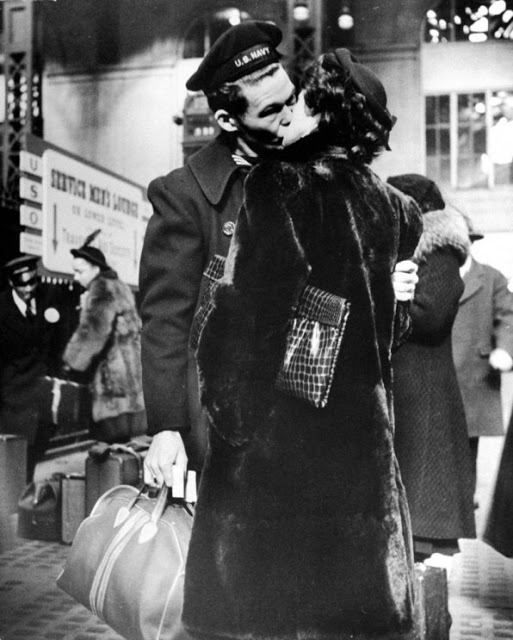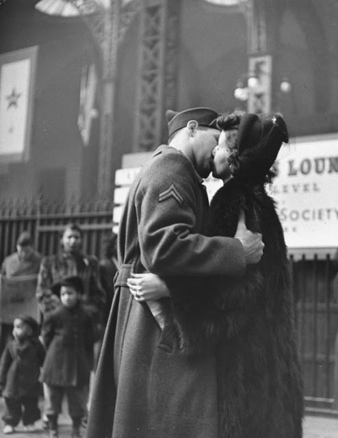 Each goodbye is a drama complete in itself. Sometimes the girl stands with arms around the boys’ waist, hands tightly clasped behind. Another fits her head into the curve of his cheek while tears fall onto his coat. Now and then the boy will take her face between his hands and speak reassuringly. Or if the wait is long they may just stand quietly, not saying anything. The common denominator of all these goodbyes is sadness and tenderness, and complete oblivion for the moment to anything but their own individual heartaches.