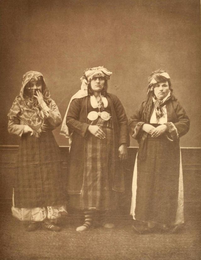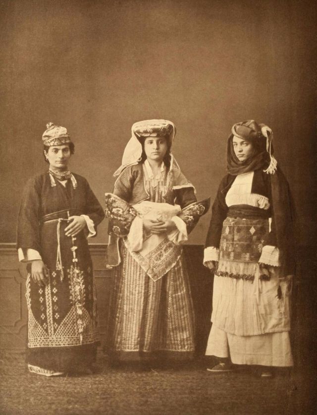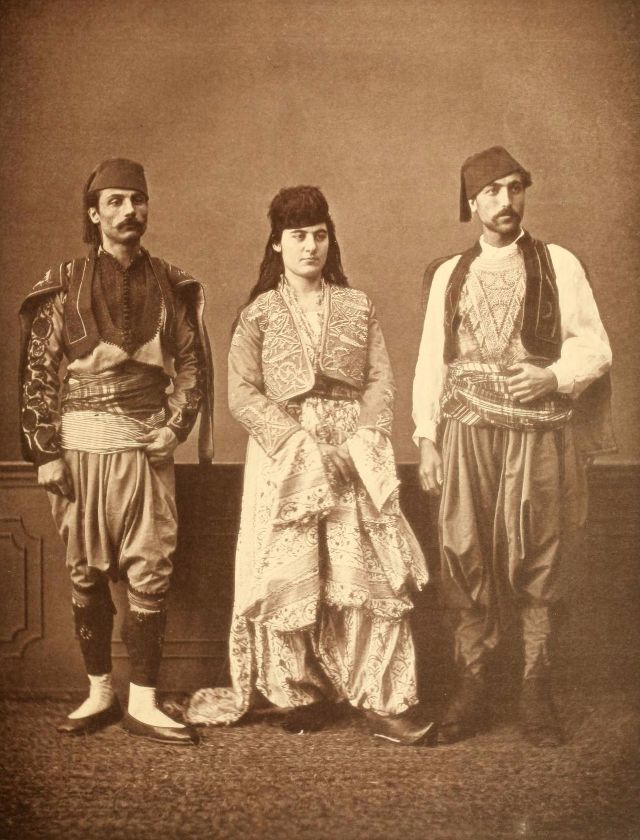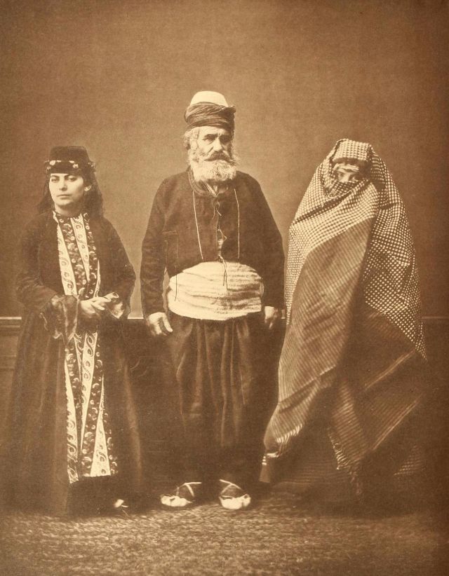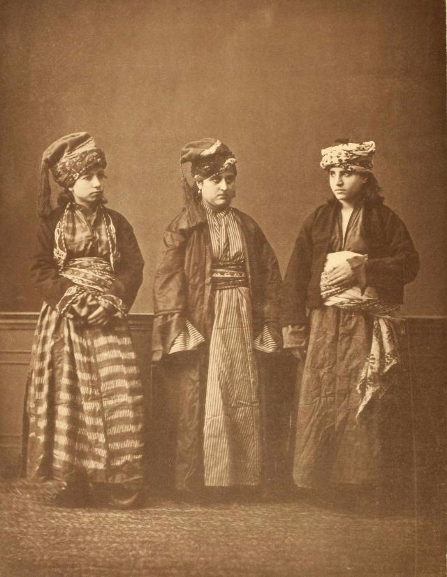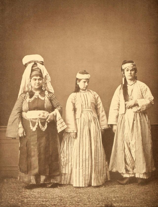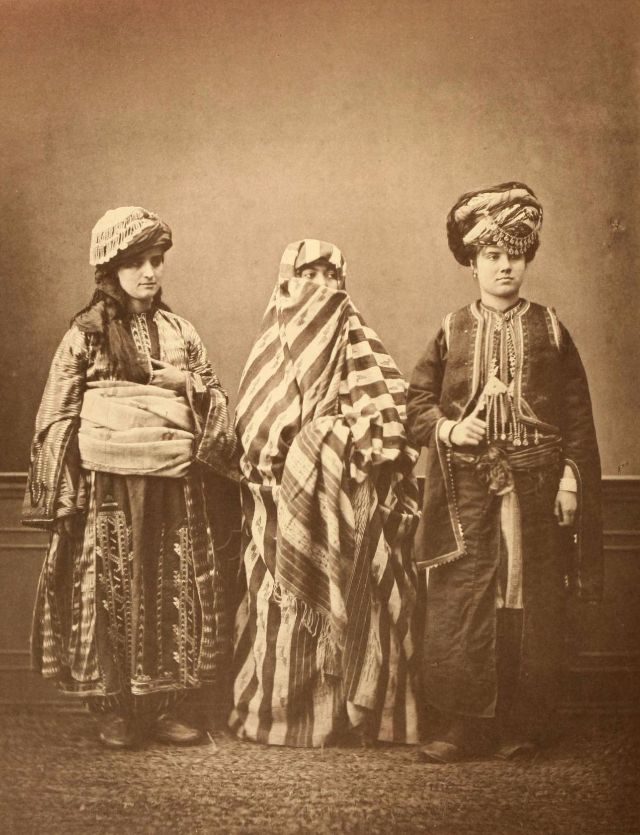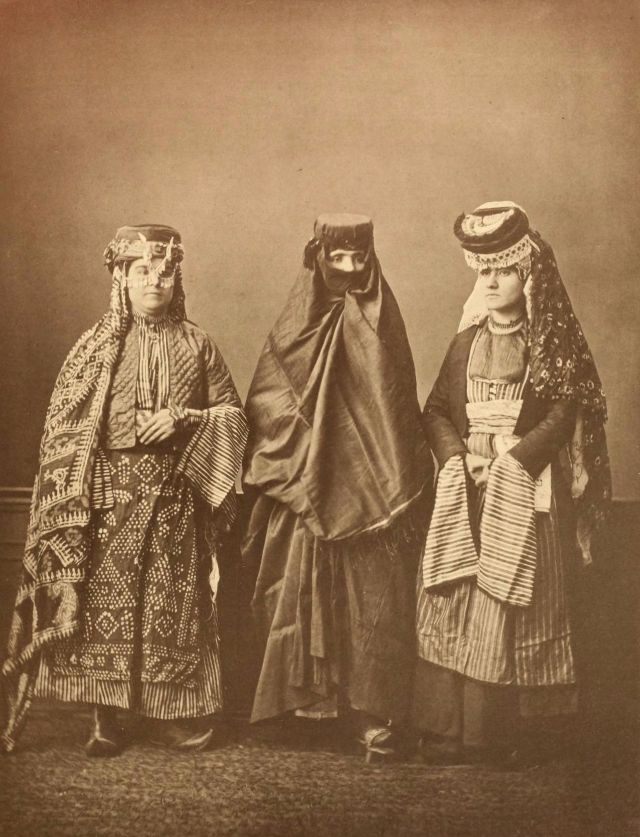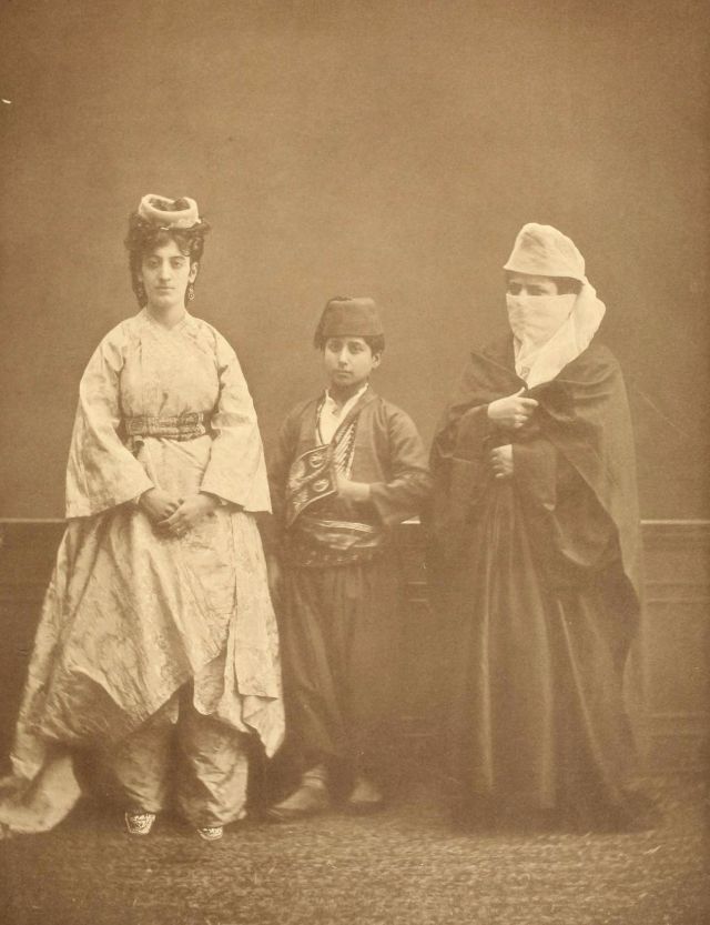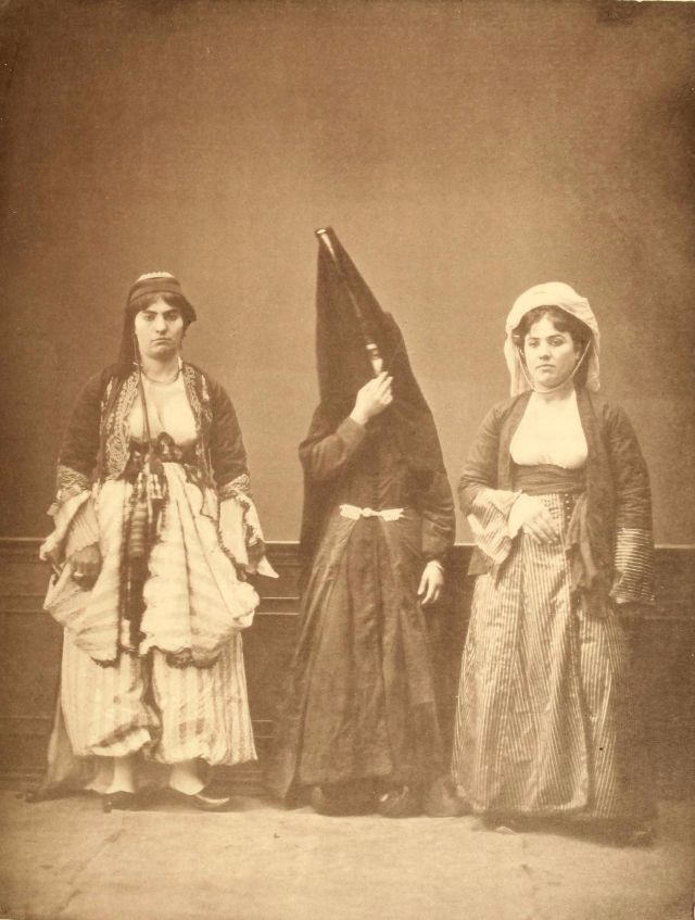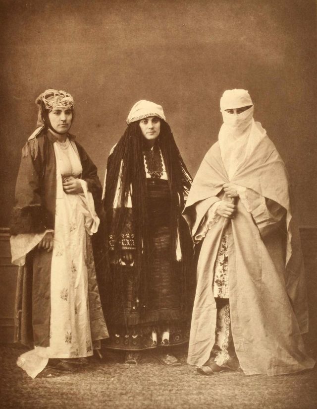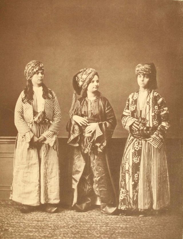 Women’s everyday wear was salvar (trousers), a gömlek (chemise) that came down to the mid-calf or ankle, a short, fitted jacket called a hirka, and a sash or belt tied at or just below the waist. For formal occasions, such as visiting friends, the woman added an entari, a long robe that was cut like the hirka apart from the length. Both hirka and entari were buttoned to the waist, leaving the skirts open in front. Both garments also had buttons all the way to the throat, but were often buttoned only to the underside of the bust, leaving the garments to gape open over the bust. All of these clothes could be brightly colored and patterned. However, when a woman left the house, she covered her clothes with a ferace, a dark, modestly cut robe that buttoned all the way to the throat. She also covered her face with a variety of veils or wraps.