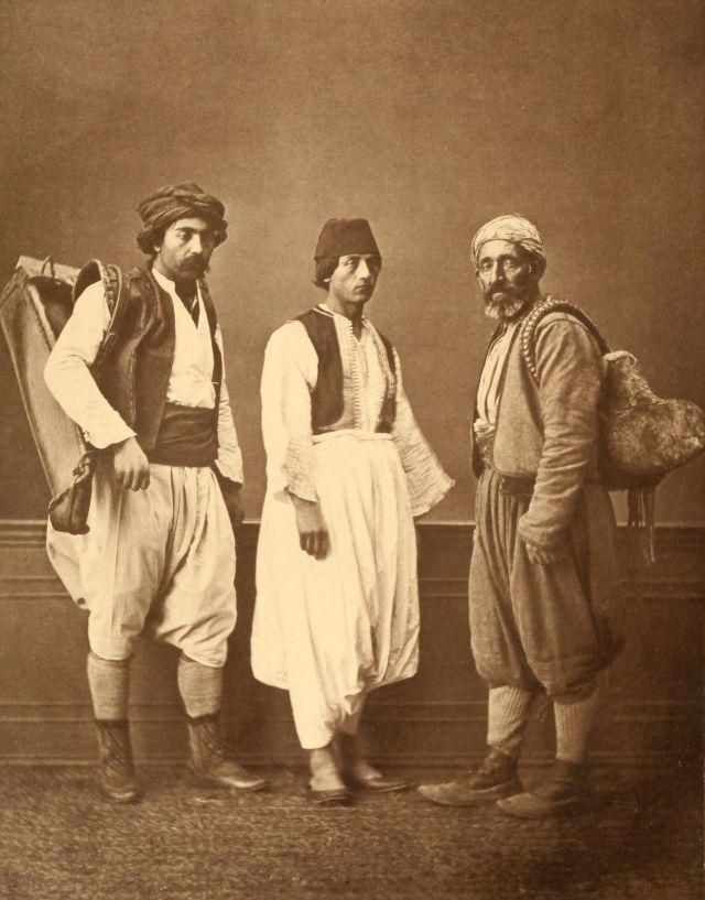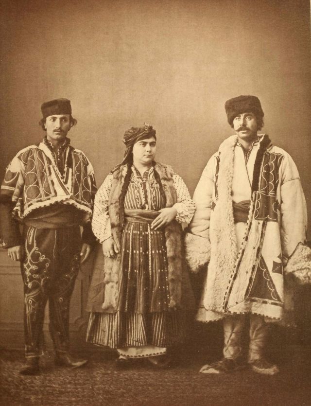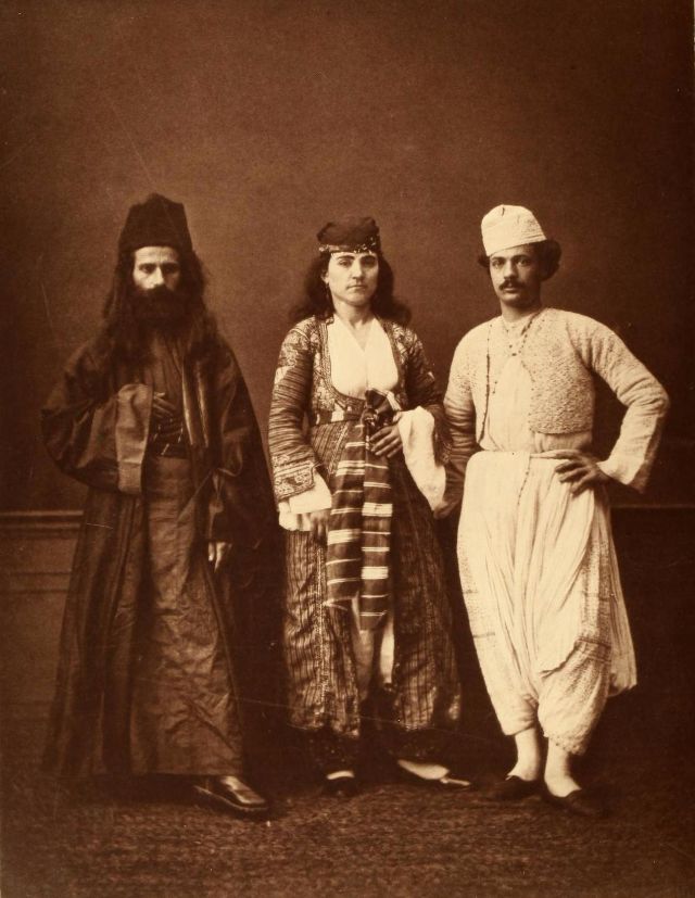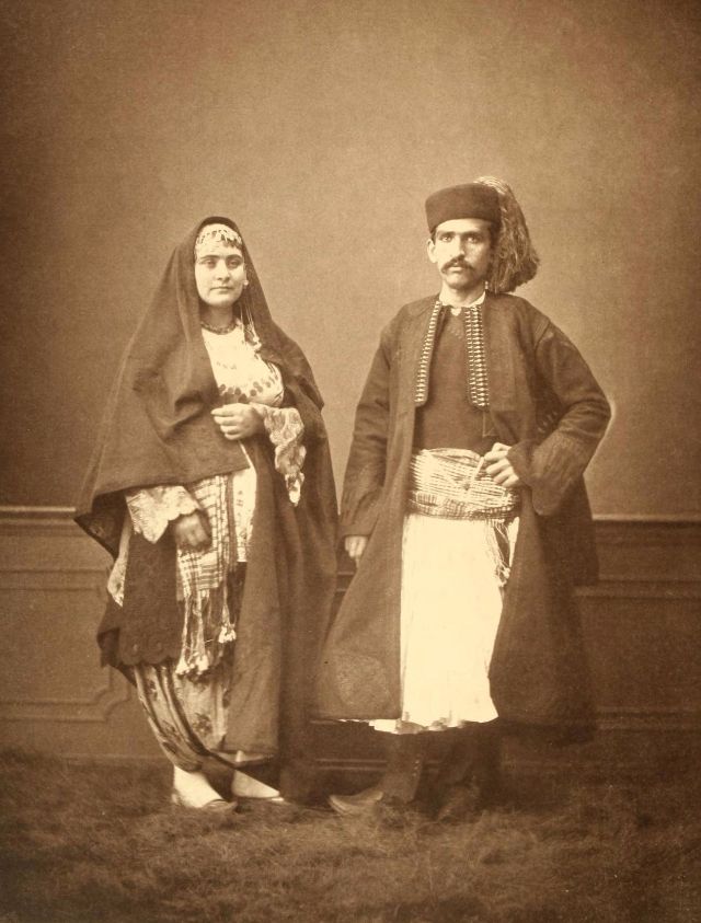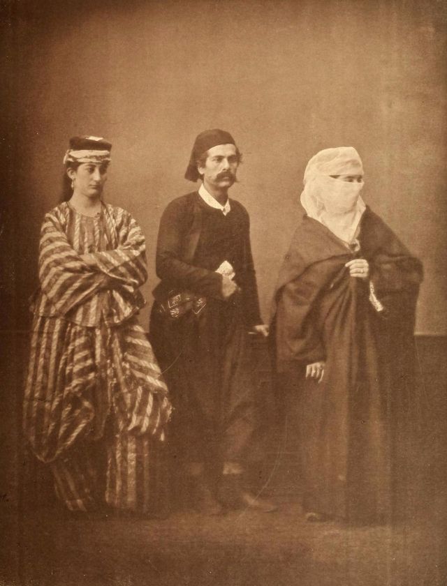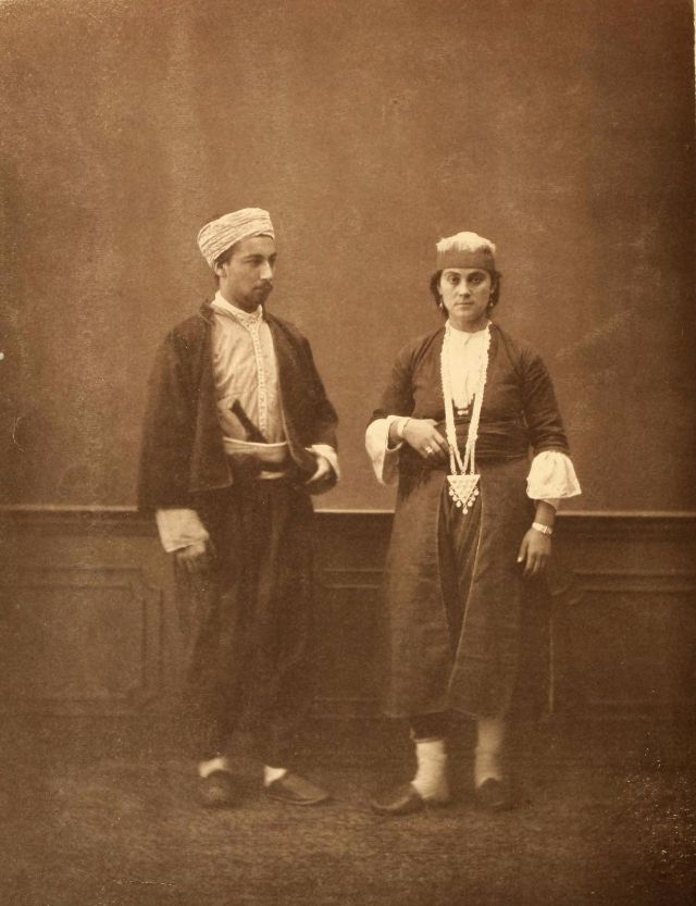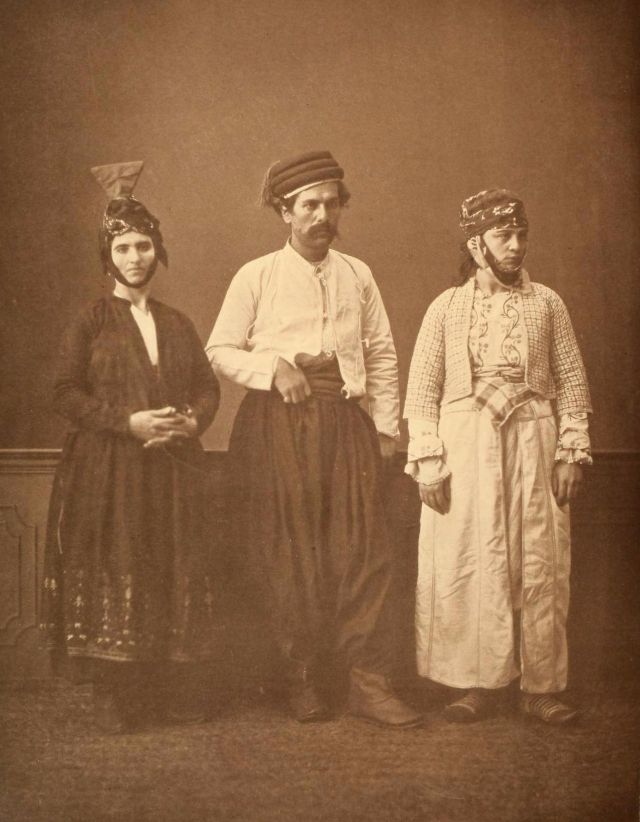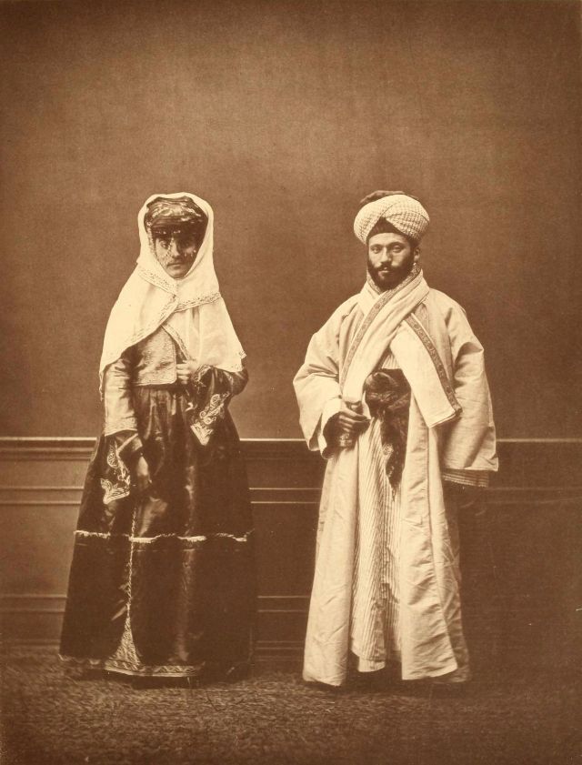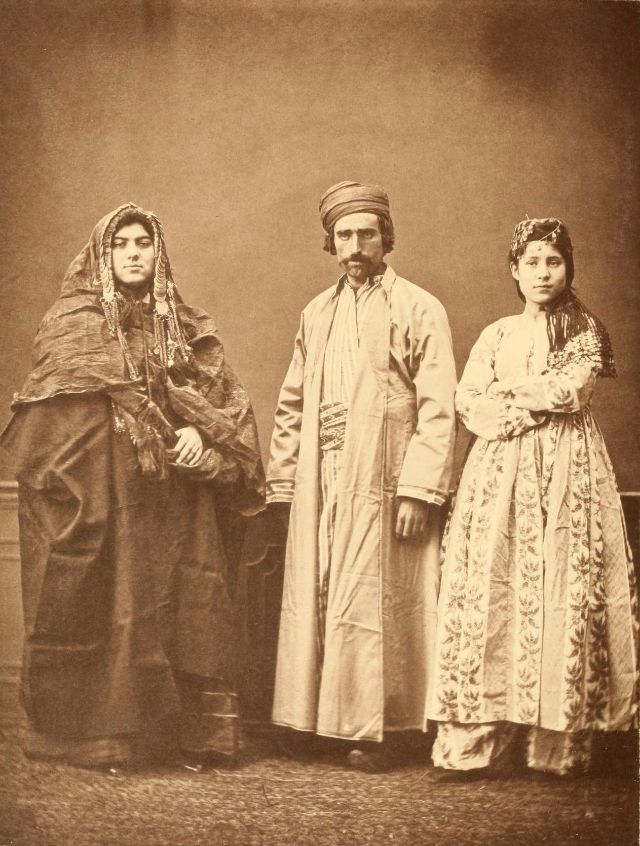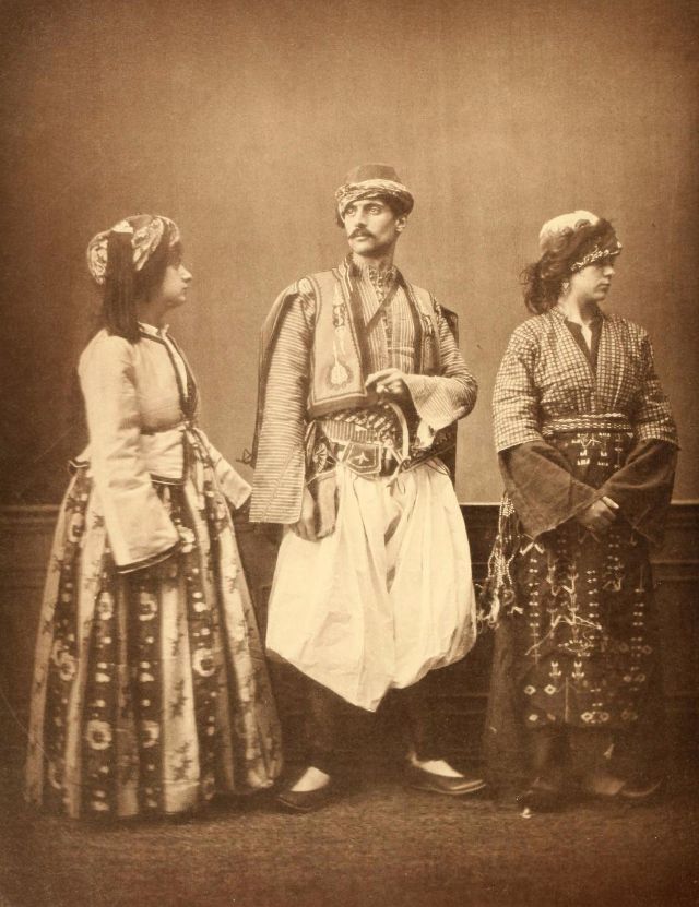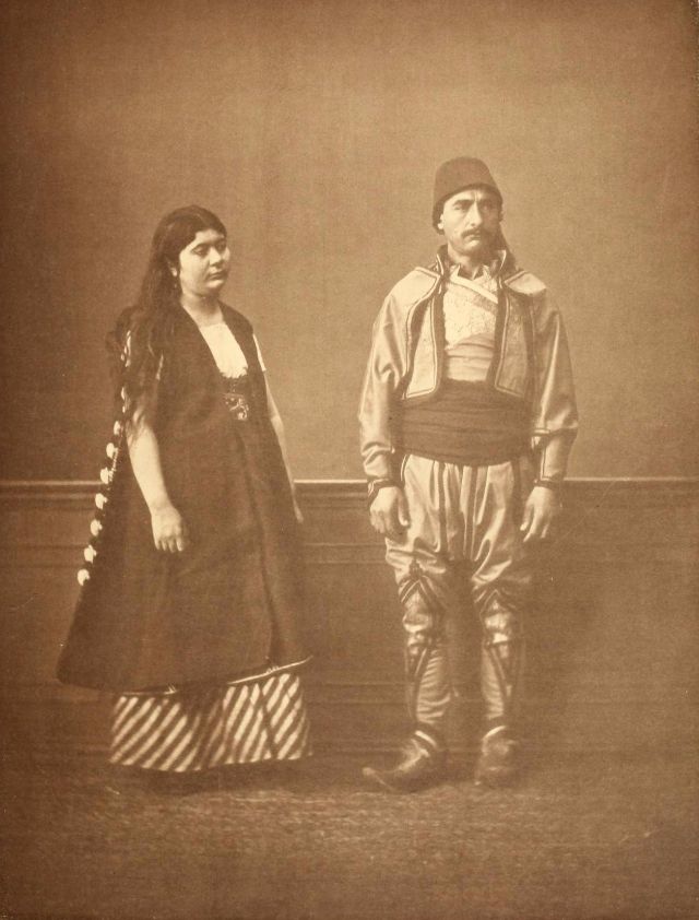 Women’s everyday wear was salvar (trousers), a gömlek (chemise) that came down to the mid-calf or ankle, a short, fitted jacket called a hirka, and a sash or belt tied at or just below the waist. For formal occasions, such as visiting friends, the woman added an entari, a long robe that was cut like the hirka apart from the length. Both hirka and entari were buttoned to the waist, leaving the skirts open in front. Both garments also had buttons all the way to the throat, but were often buttoned only to the underside of the bust, leaving the garments to gape open over the bust. All of these clothes could be brightly colored and patterned. However, when a woman left the house, she covered her clothes with a ferace, a dark, modestly cut robe that buttoned all the way to the throat. She also covered her face with a variety of veils or wraps.