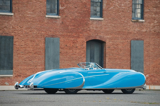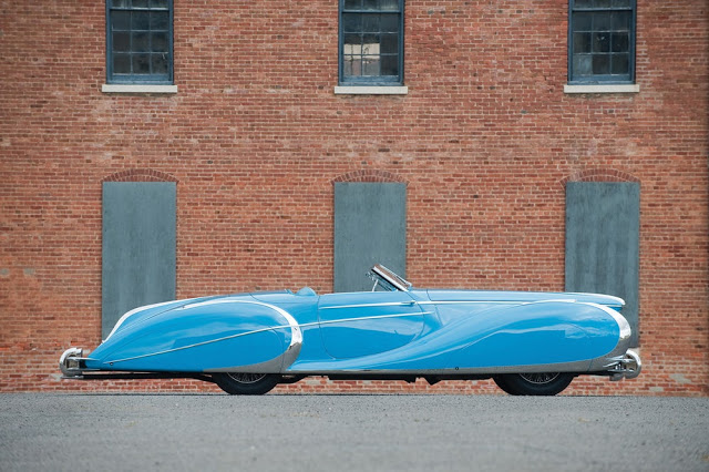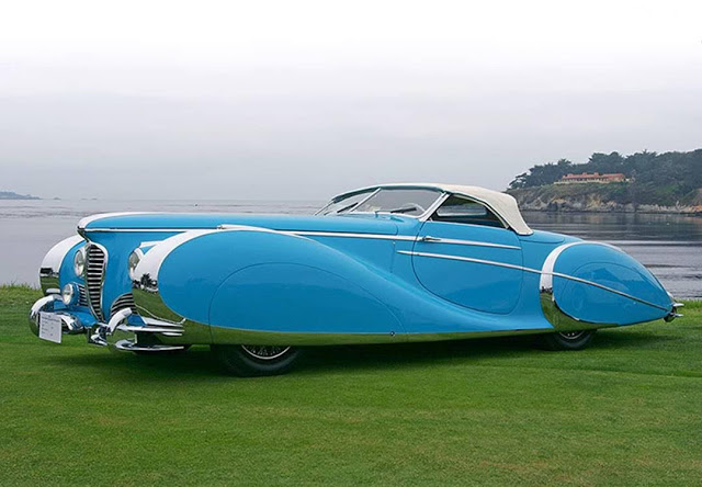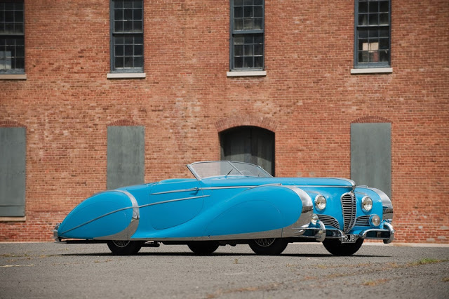 The most dramatic of all supercars is this 2-seat roadster which was owned by English movie star Diana Dors. Built for the post-war concours circuit, Saoutchik was responsible for its extreme body which borrowed styling cues from other earlier designs.