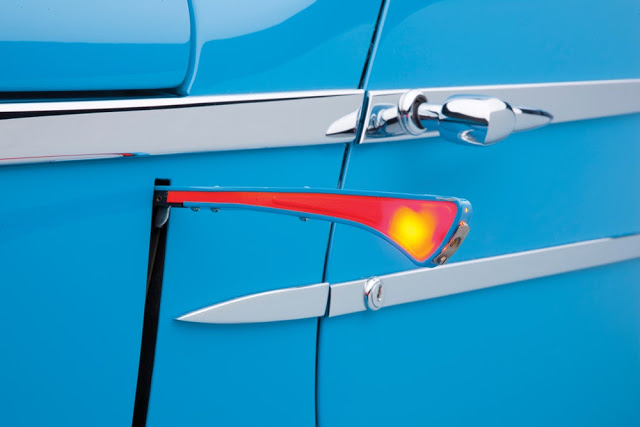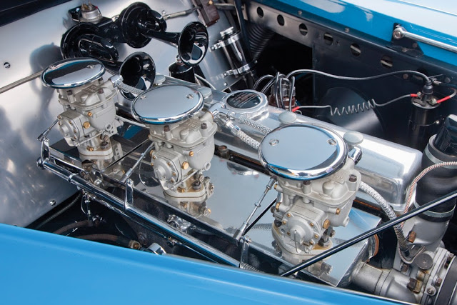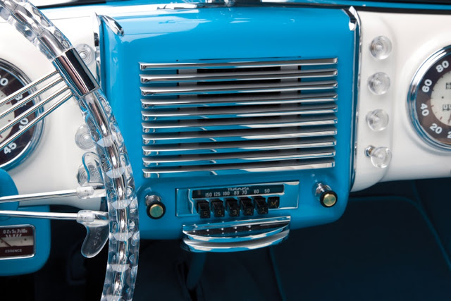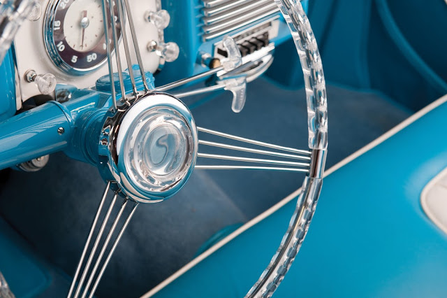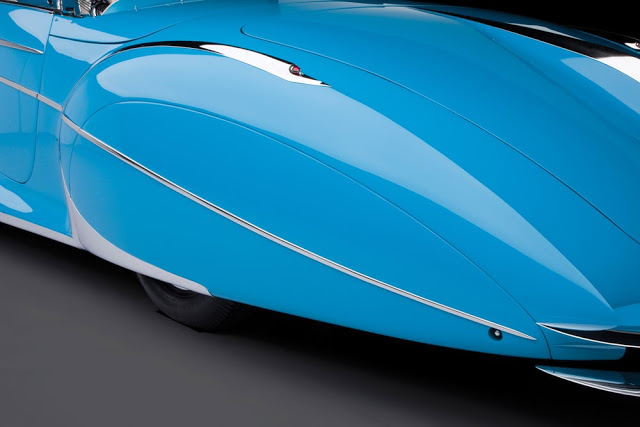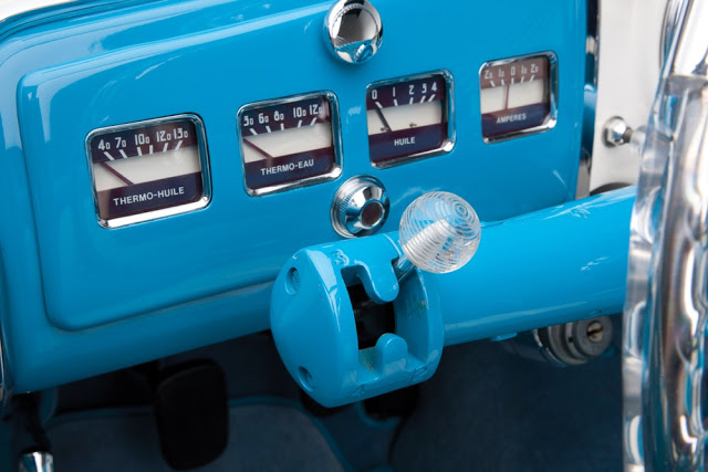 Much of this Delahaye’s beauty is also shown in details such as chrome accents that highlight the curves and feature embedded turn signals or the small strips which flank the side and add a sense of speed while hiding the door handles. At the front is a curious nose which was inspired by the Figoni et Falaschi-designed Narval produced just a year earlier. Inside, a two-tone interior is relentlessly busy and features a medley of designs that work together in their excess. Rows of knobs are everywhere and the see-through steering wheel made of lucite is unique.