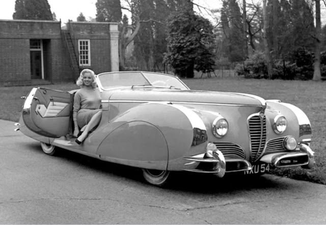 British actress Diana Dors and her 1949 Delahaye 175 S Saoutchik Roadster.