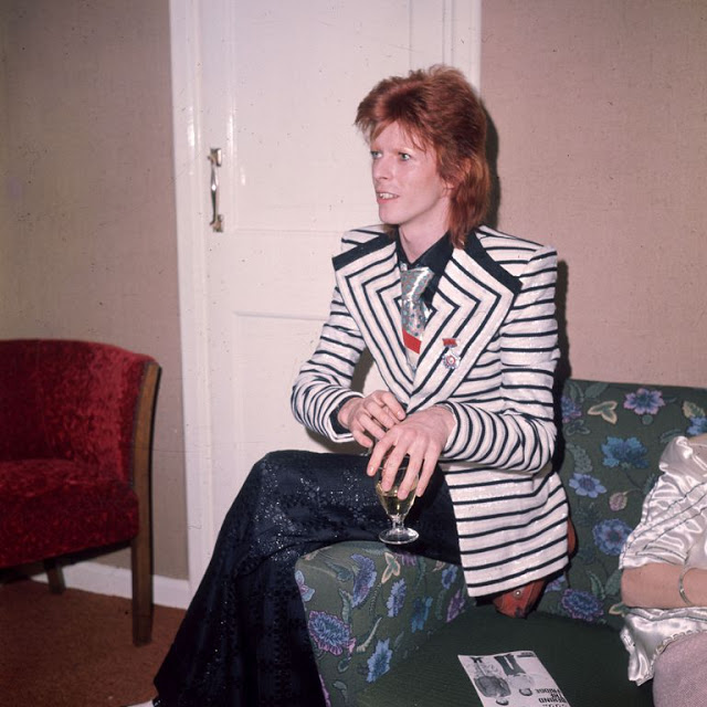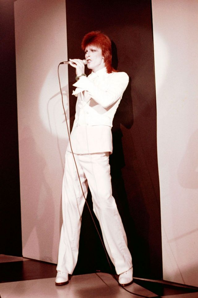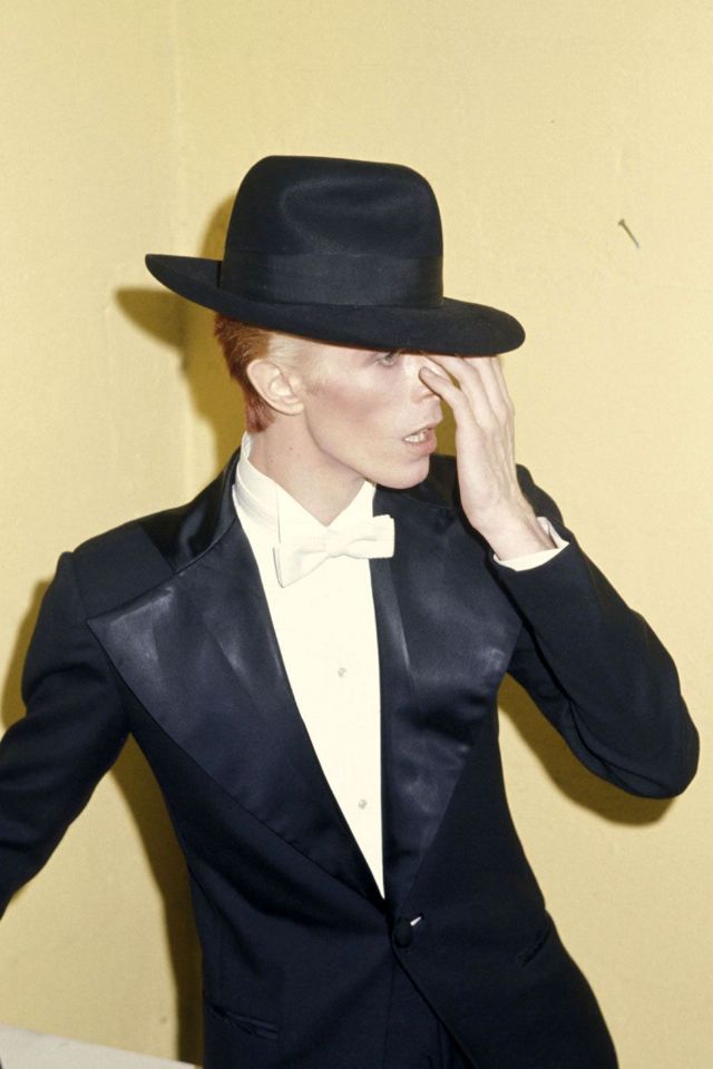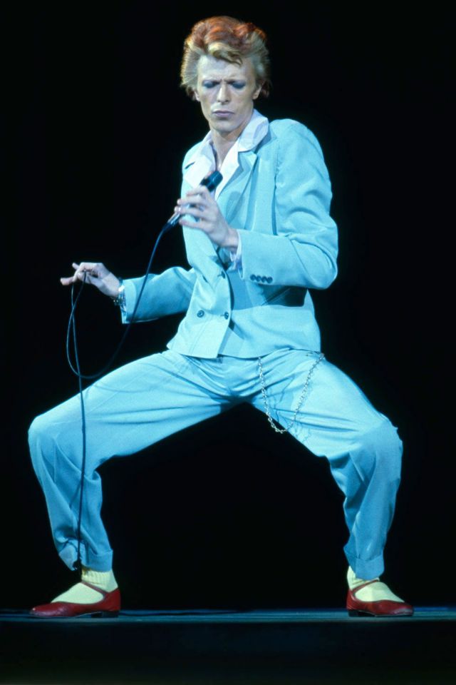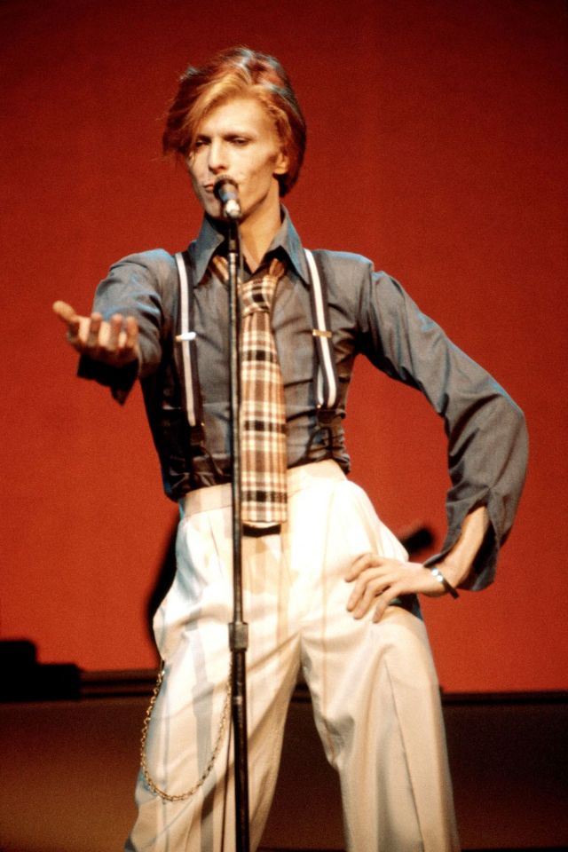 In wide leg pants posing for a portrait promoting the Hunky Dory album in London, 1971.In a striped jumpsuit and platform boots posing for a portrait as Ziggy Stardust in London, 1972.In an asymmetrical bodysuit performing onstage as Ziggy Stardust, 1972.In lace up boots and a printed jumpsuit being interviewed at home in Beckenham, London, 1972Wearing a fringed number designed by Kansai Yamamoto performing at the Hammersmith Odeon, 1973.In all-white performing at The Marquee Club in London, 1973.In a number-printed jumpsuit on his Stardust tour, 1973.In a billowing robe performing on stage, 1973.In a colorful quilted set photographed in a New York City hotel room, 1973.In a blue feather boa performing in Los Angeles, 1973.In an all-white look performing in Los Angeles, 1973.With designer Kansai Yamamoto, 1973.In a Kansai Yamamoto-designed bodysuit performing at the Hammersmith Odeon, 1973.In a silk flared jumpsuit posing for a portrait in New York City, 1973.In a printed mini dress performing on his Ziggy Stardust/Aladdin Sane tour in London, 1973.In a look by Japanese Designer Kansai Yamamoto, 1973.In a striped blazer with wide lapels caught candid, 1973.In a blue suit performing in Los Angeles during his Diamond Dogs tour, 1974.In sunglasses, pictured in England, 1974.In a yellow suit for a promo photo, 1974.In a top hat, heeled boots, and overalls posing his album Diamond Dogs, 1974.In suspenders and a plaid tie performing at Radio City Music Hall during the Philly Dogs Tour, 1974.In an eye patch and red overalls performing “Rebel Rebel” on the TV show TopPop in Hilversum, Netherlands, 1974.In a suit and wide brim hat for a promo photo, 1974.In a fedora and suit at the 17th Annual Grammy Awards, 1975.In a jumpsuit and sneakers posing for a portrait, 1976.In pleather pants performing in Oakland, California, 1978.In a sailor cap and parachute pants on his Low/Heroes tour at Madison Square Garden, 1978.