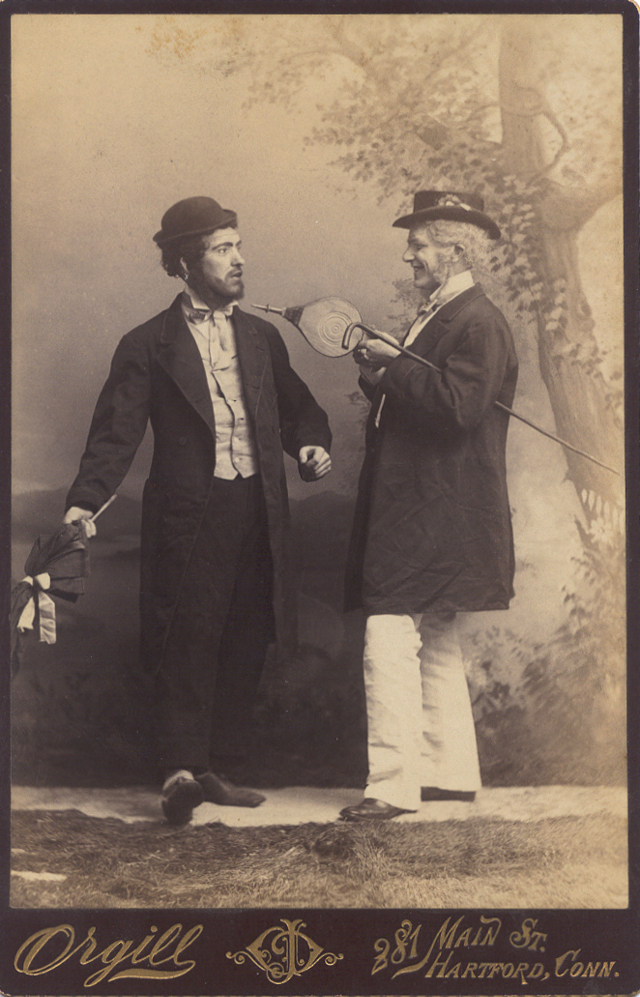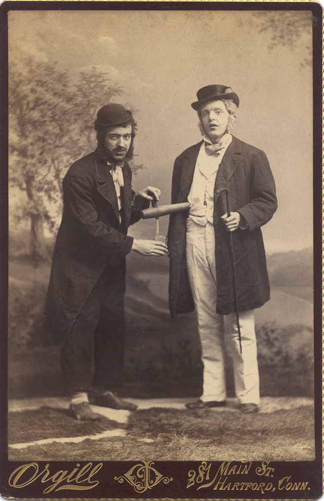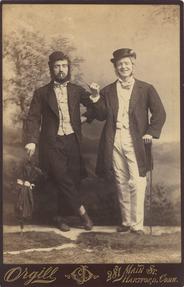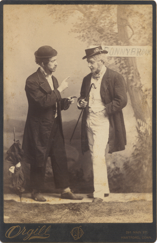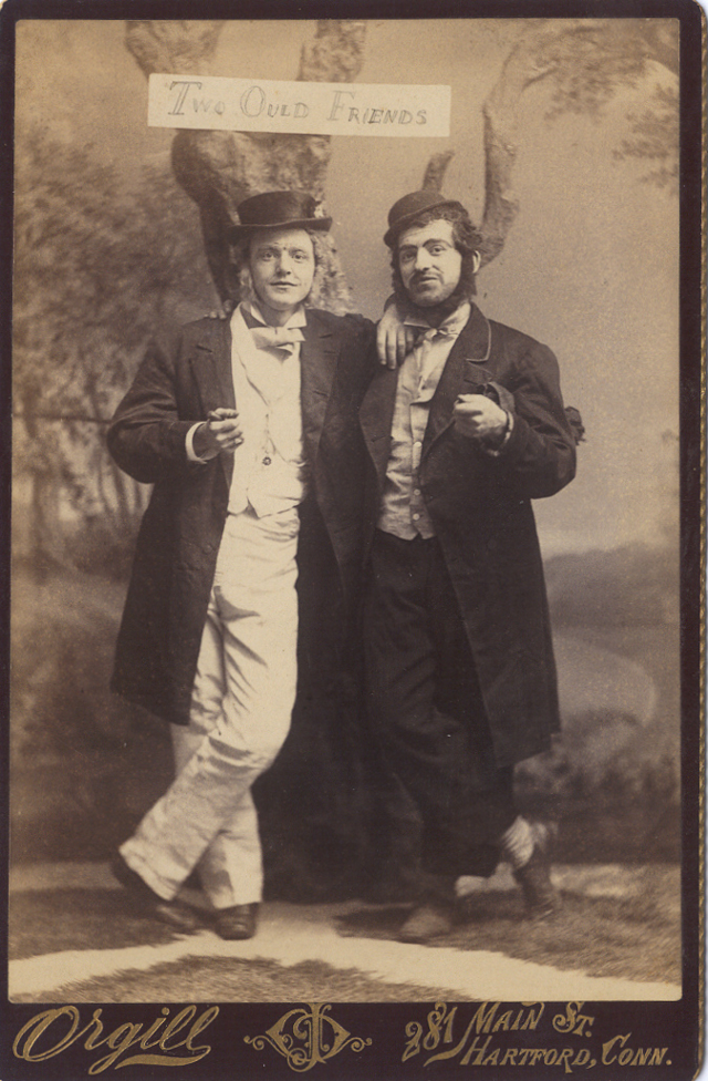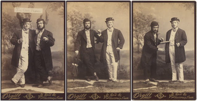 Group of six creative cabinet cards that were most likely used to advertise the photography studio of Orgill, (John), Hartford, Connecticut. This marvelous series has an Irish theme as we see two buddies leaning on each other with a sign above that reads, Two Ould Friends.