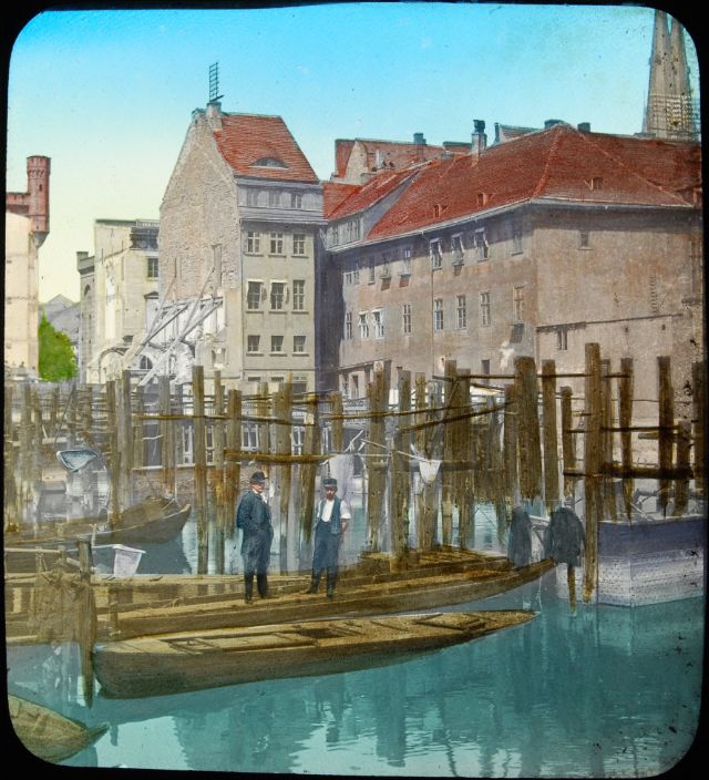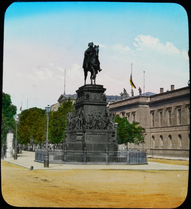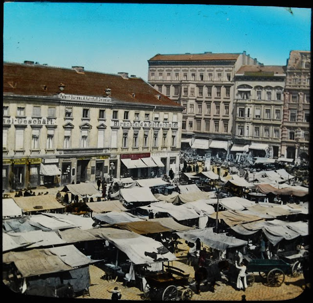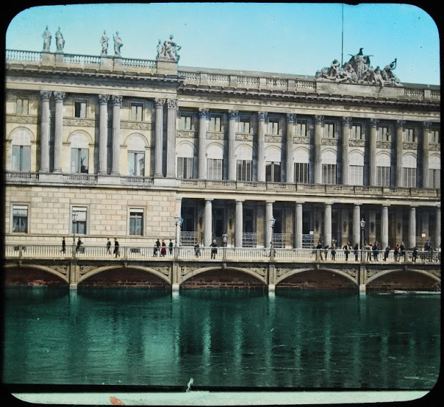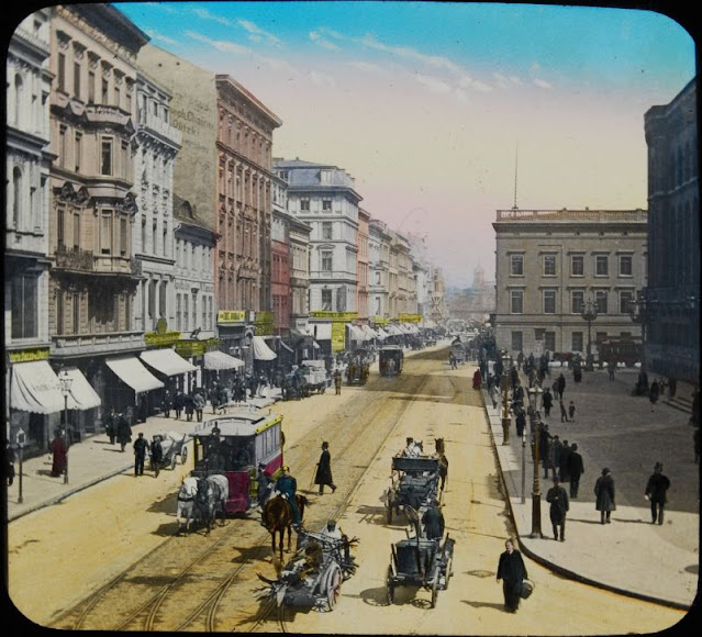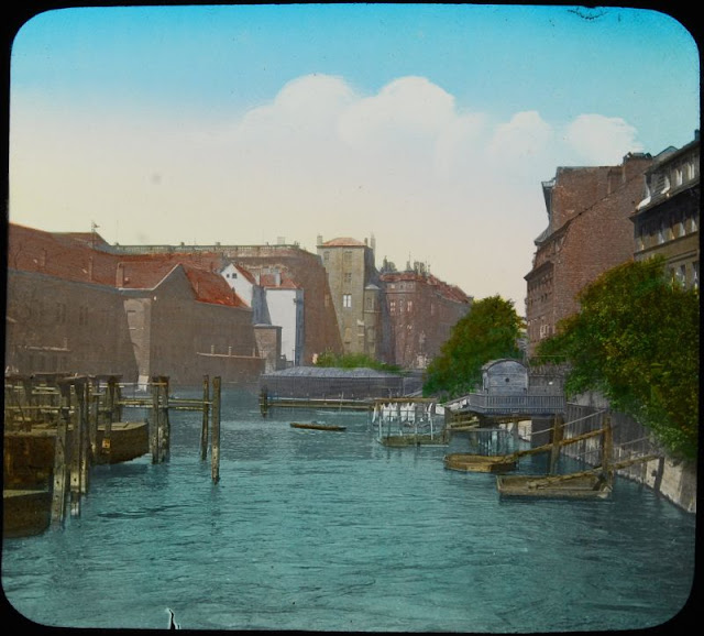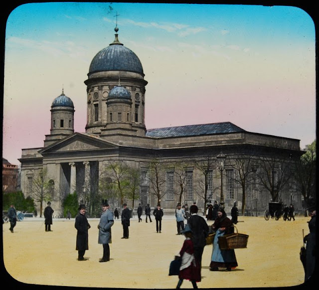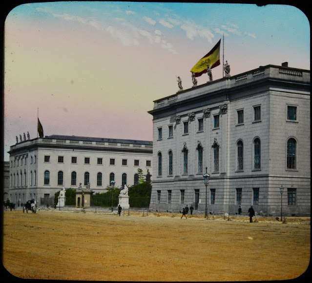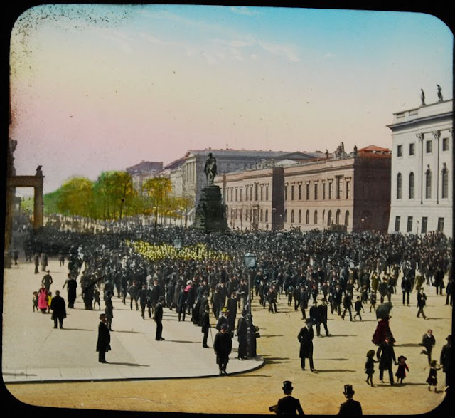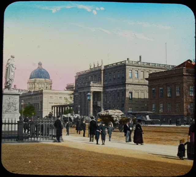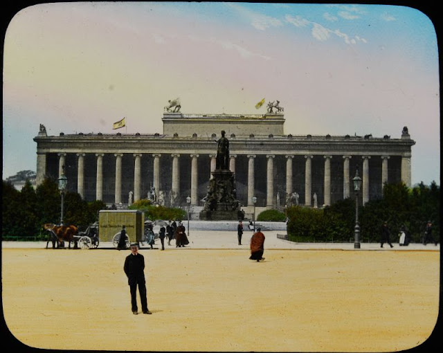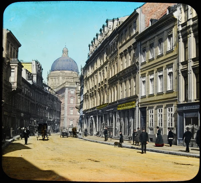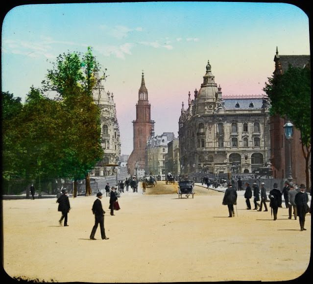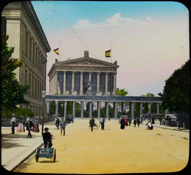 Here below is a set of colored magic lantern slides that shows street scenes of Berlin in the late 19th and very early 20th centuries.