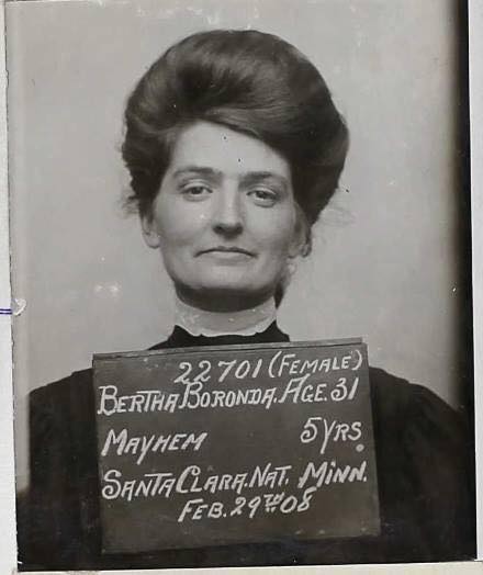 In 1908, Bertha Boronda was found guilty of “Mayhem” and sentenced to 5 years in a Minnesota state prison for cutting off her husband’s penis with a straight razor.