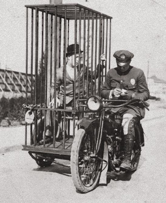 A police officer riding a Harley-Davidson motorcycle transports a prisoner inside a mobile booking cage, 1921