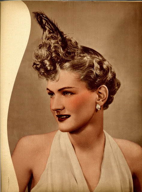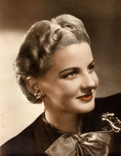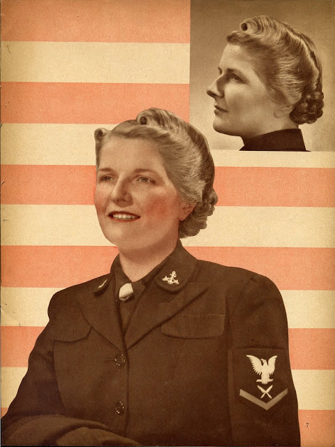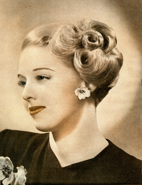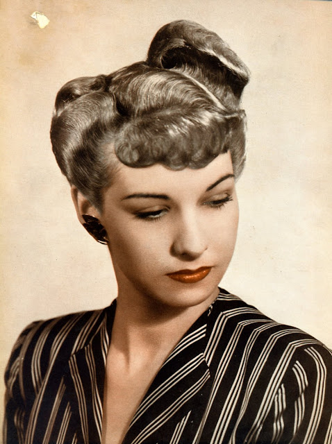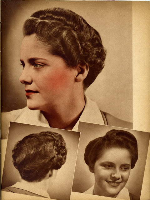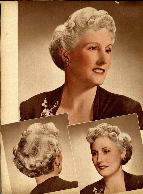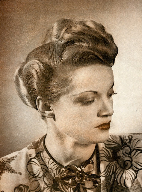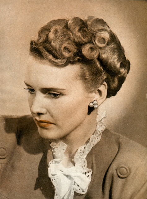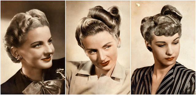 As war rationing really began to bite, women still spent time and effort on their hairstyles, but no longer wanted lots of waves in intricate designs. Hair was worn shorter, in a practical style, still curly with a wave or two at the front. This sort of style looked good under small hats and military hats and could be hidden under turbans if the hair was dirty.