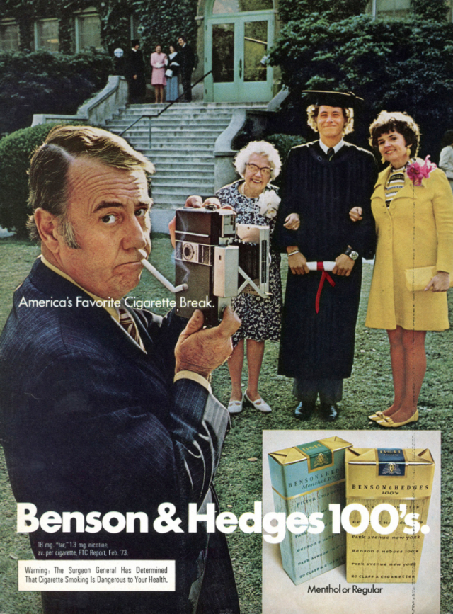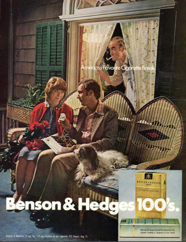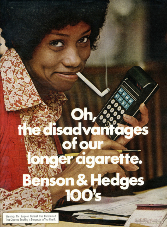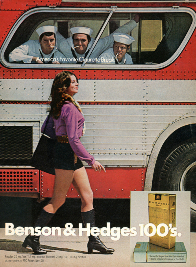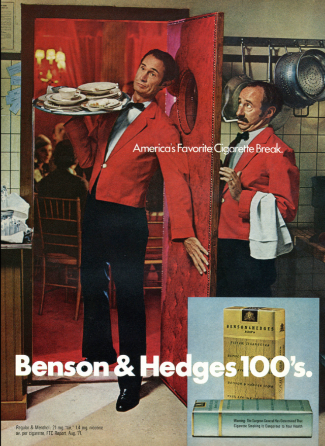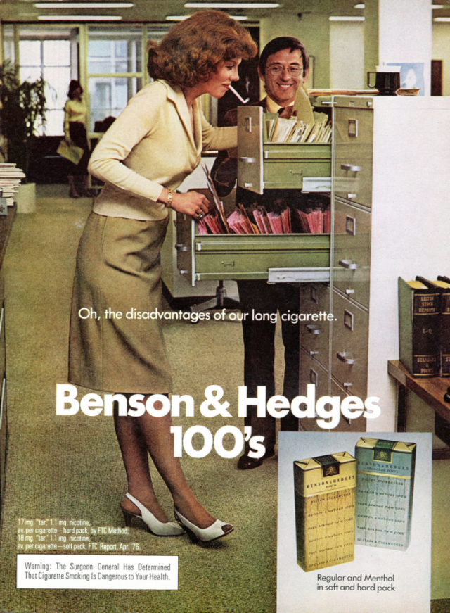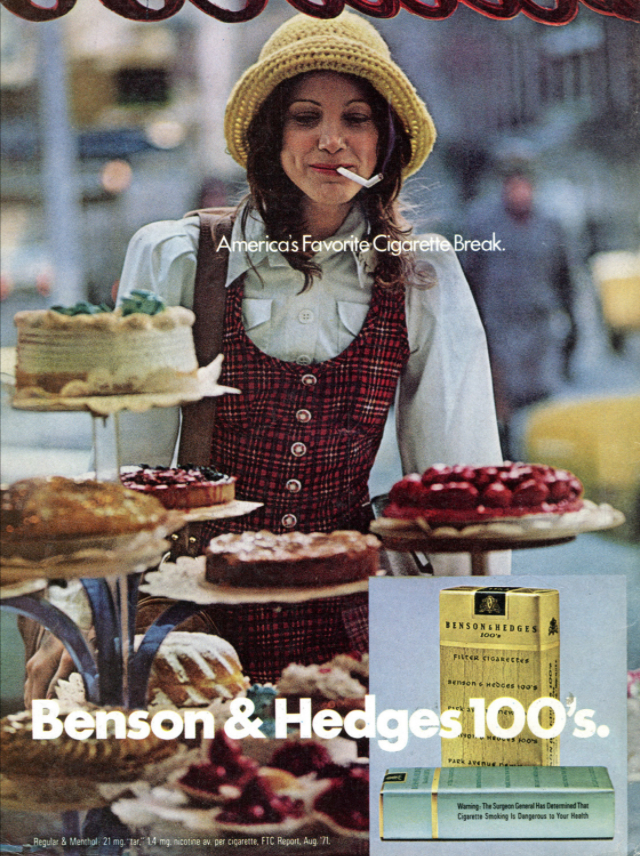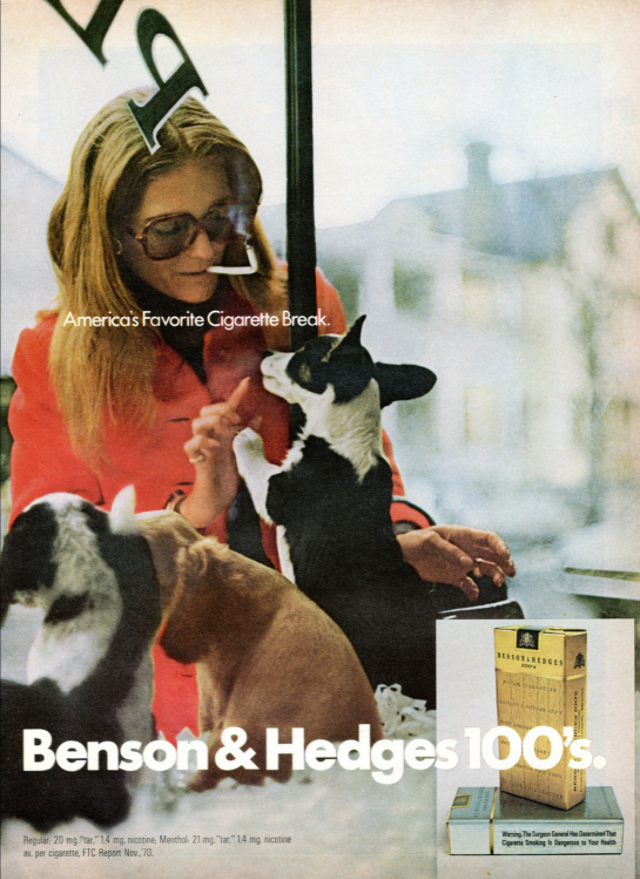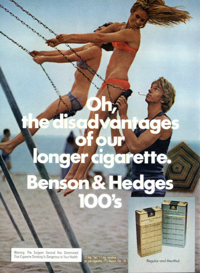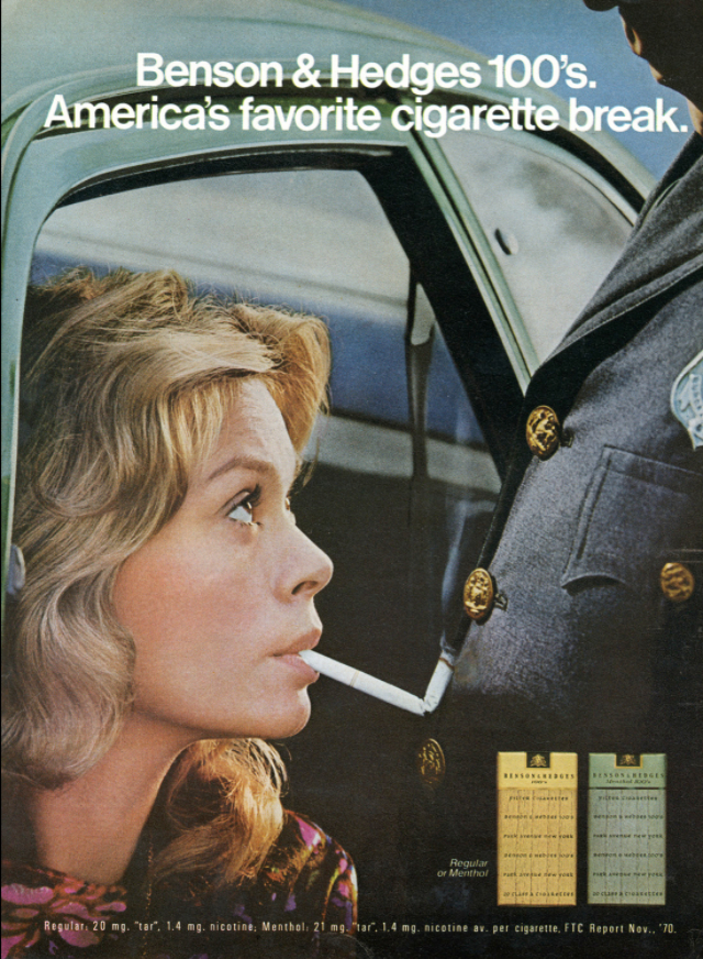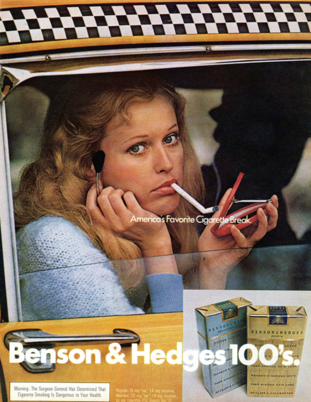 In July 1968, Philip Morris released Virginia Slims which were a spin-off of Benson & Hedges intended to be sold to women. They were sold during a period of time where society was beginning to realize the dangers of smoking. Therefore, they were a thinner and more “elegant” alternative to regular cigarettes.