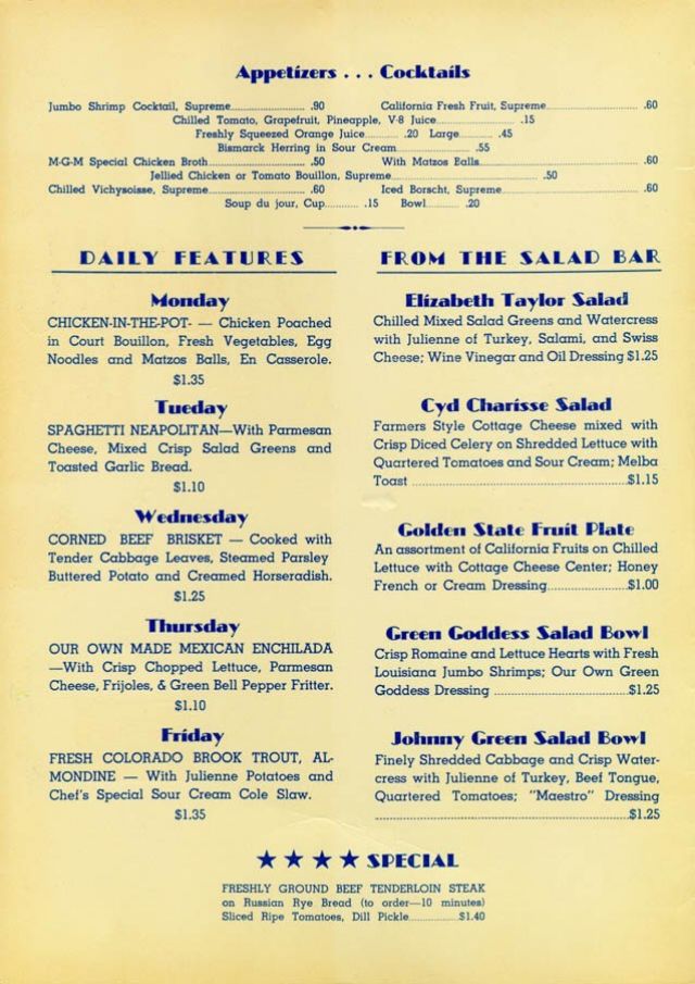 Elizabeth Taylor Salad or Cyd Charisse Salad, Anyone? Here’s the MGM Commissary Menu From the Late 1950s